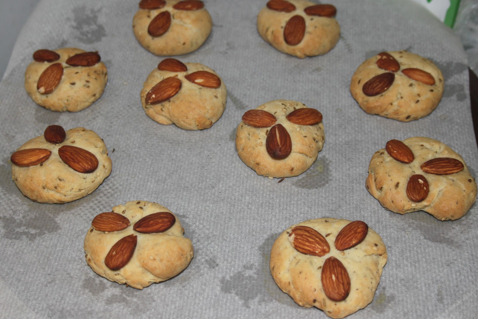 - Placer 3 amandes sur chaque petit pain. Laisser ensuite lever à tempéature ambiante pendant 30 minutes.