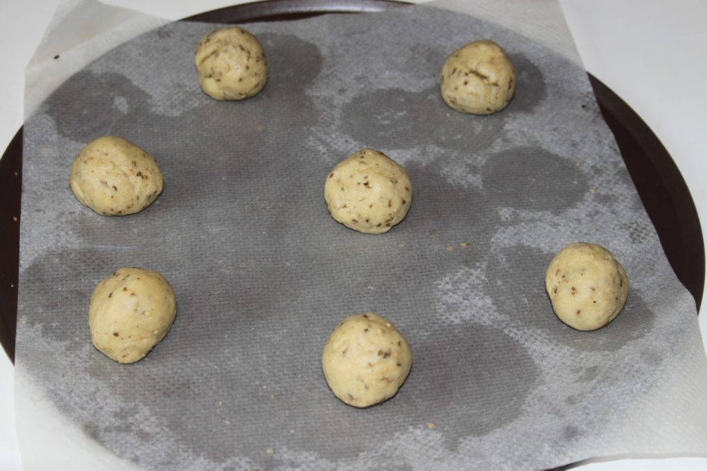 Former des boulettes de 30g chacune. Les placer sur une plaque à pâtisserie garnie de papier sulfurisé.