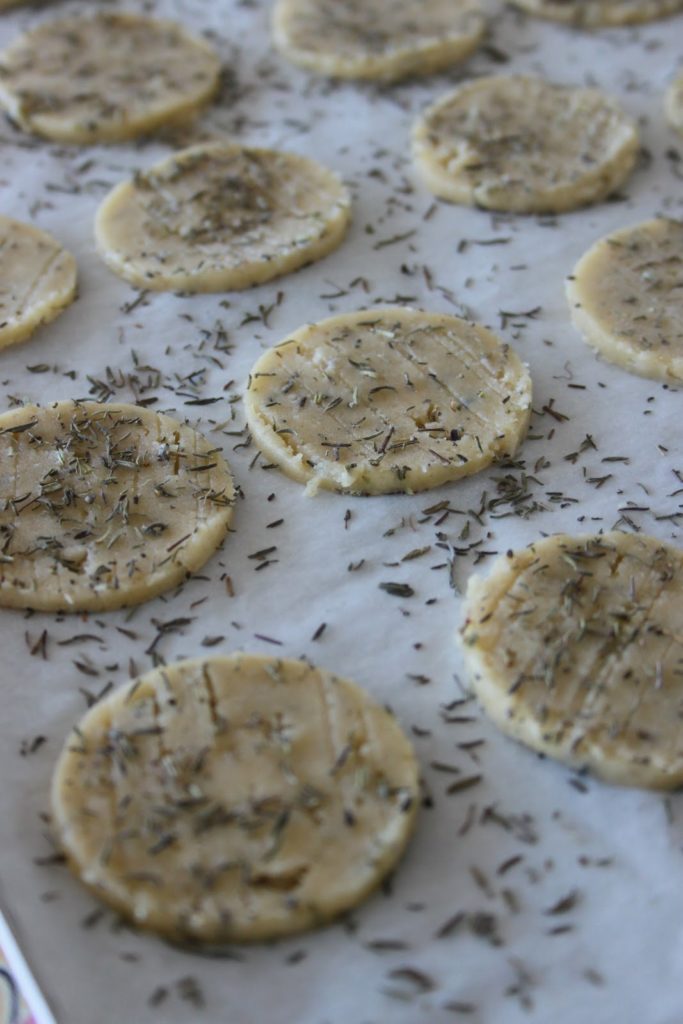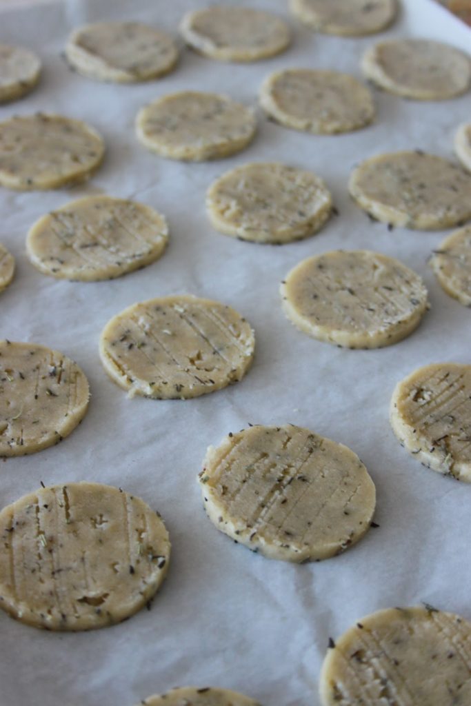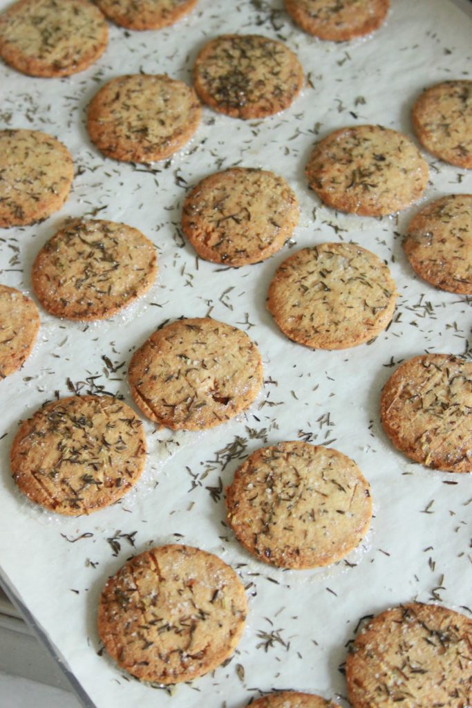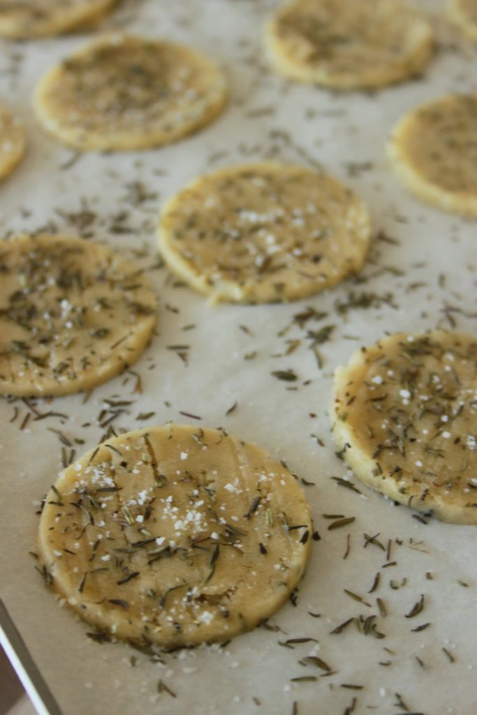 - Puis de la fleur de sel. Aplatir très légèrement les sablés avec la main pour incruster le sel et les herbes dans la pâte.