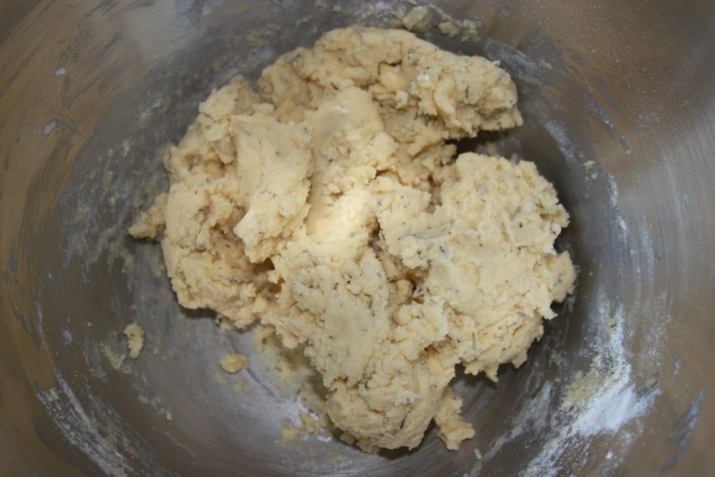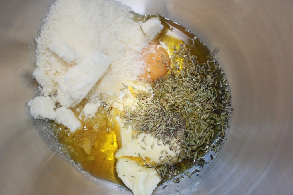 - Mettre le parmesan râpé, le sel, les herbes, le beurre, l’huile d’olive et l’oeuf dans un bol et bien mélanger pour obtenir une crème.