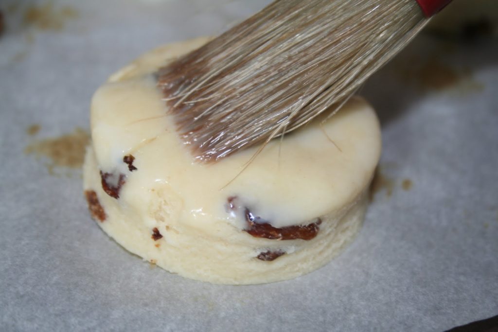 Badigeonner au pinceau avec du lait sucré (au sucre glace, sinon il y a des morceaux de sucre).