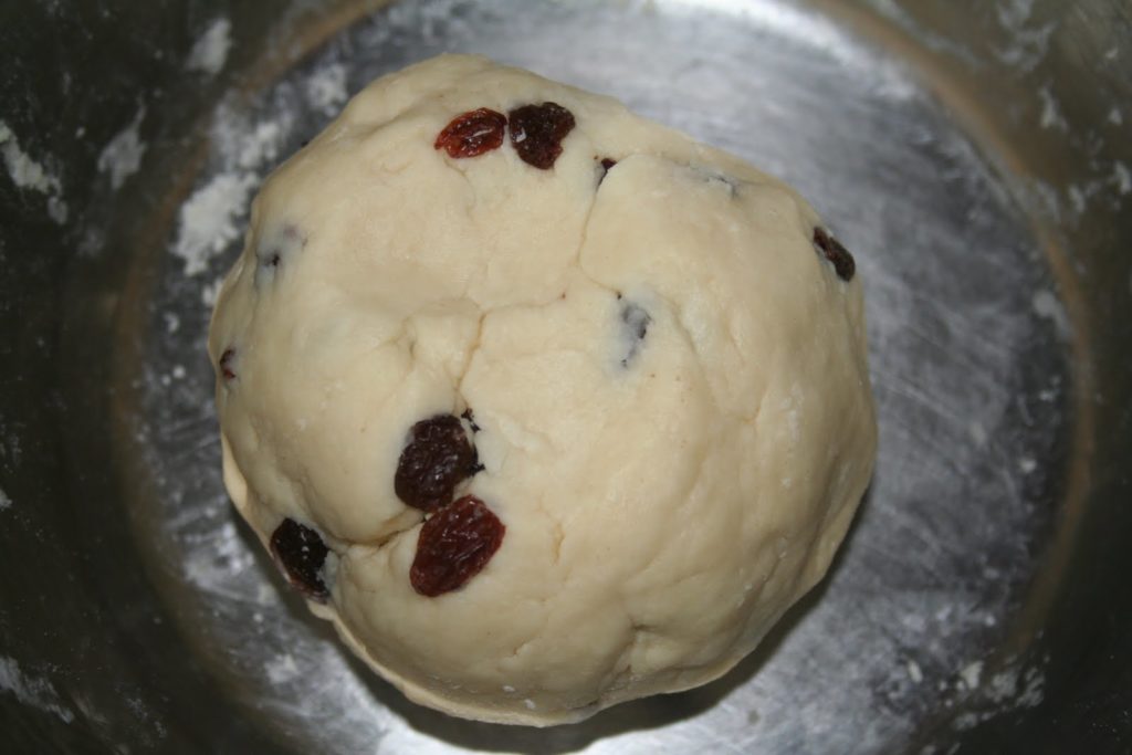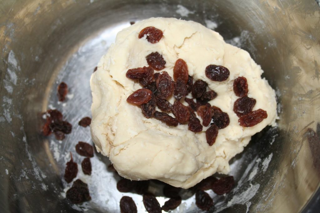 - Bien mélanger et ramener la pâte en boule. Ajouter les raisins.