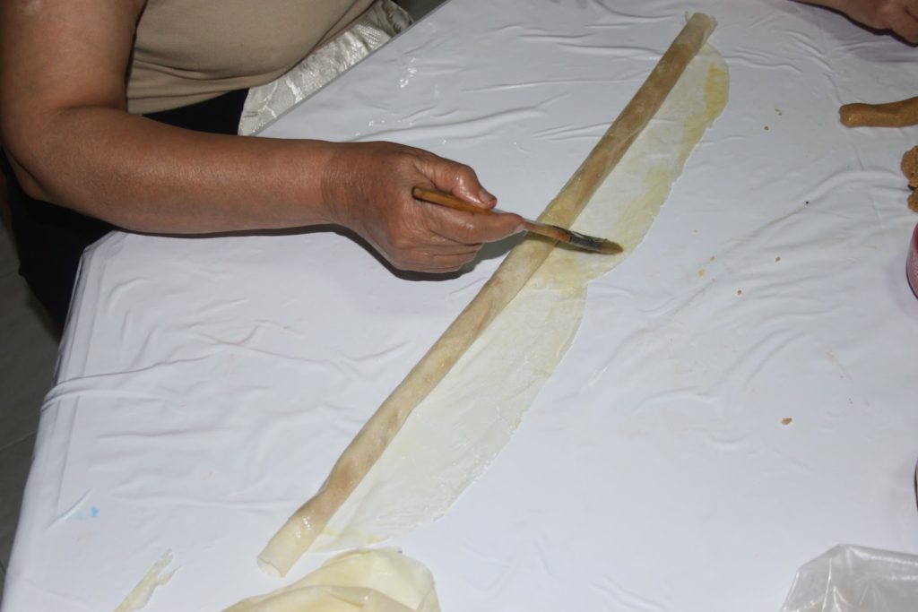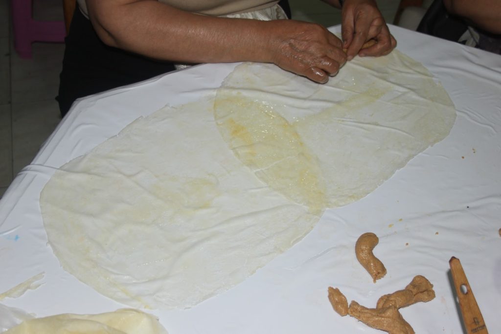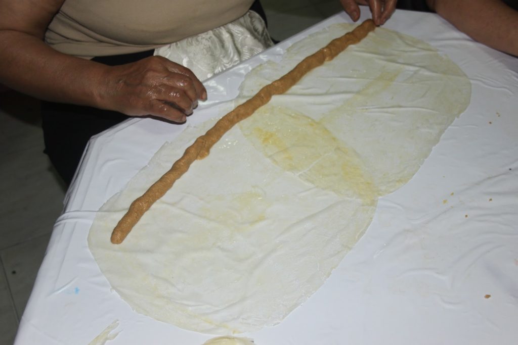 - Former un de un à 1,5cm de diamètre avec la farce aux amandes. Poser à la base des feuilles de brick.