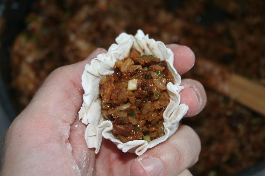 Et remplir d’une bonne grosse cuillerée à soupe de farce au riz gluant.