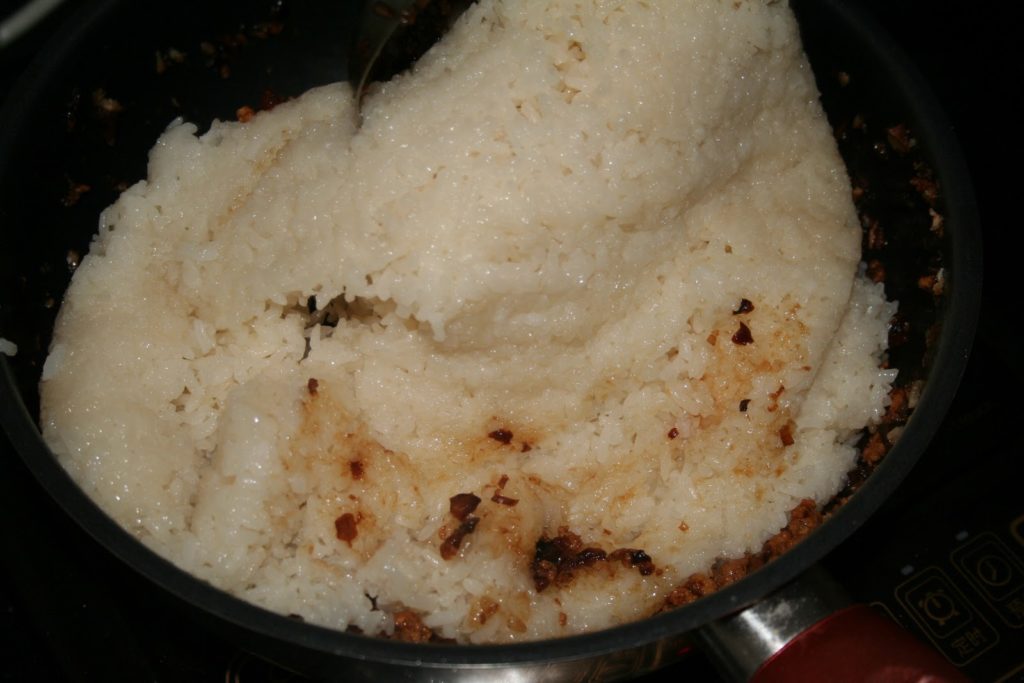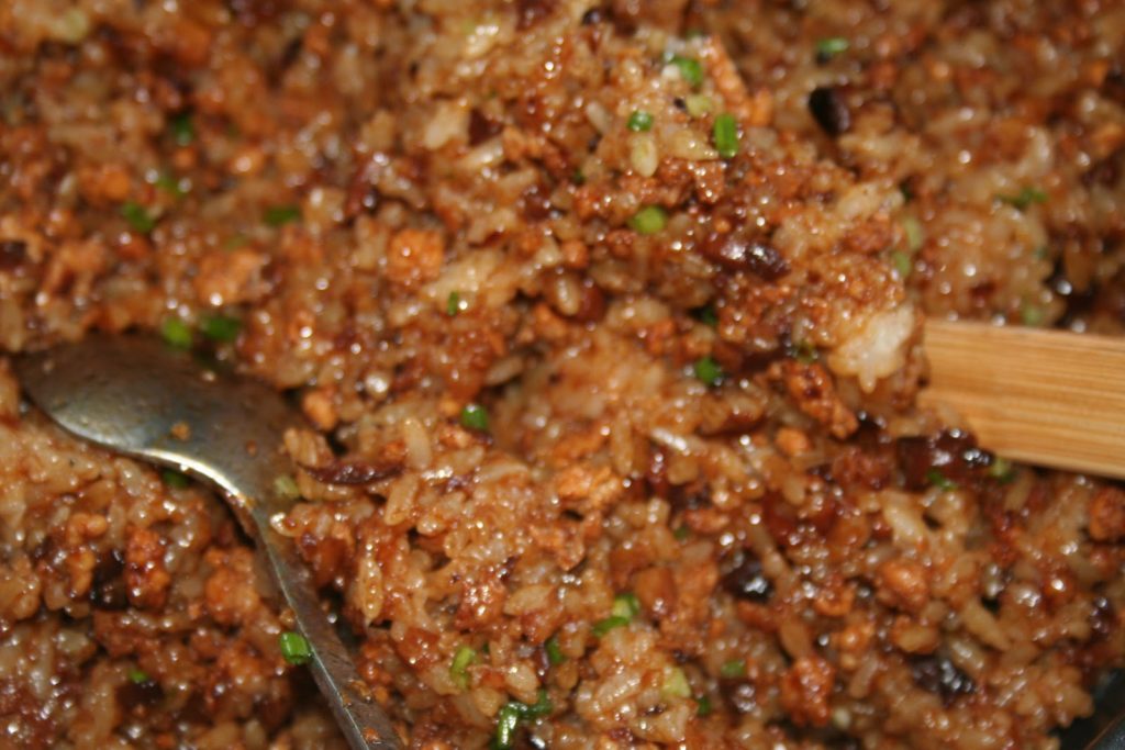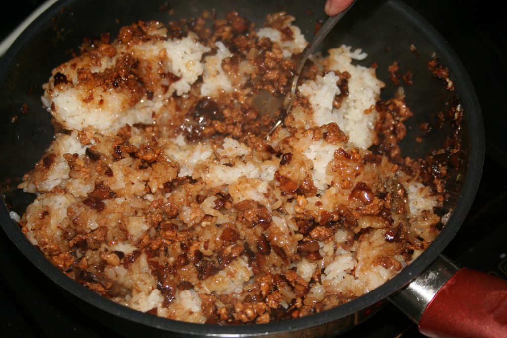 - Préparer le riz gluant (recette en cliquant ici). Pendant ce temps, faire revenir les shiitakes avec le porc, le sucre, la sauce de soja foncée dans une cuillerée d’huile. Laisser l’eau des champignons s’évaporer.