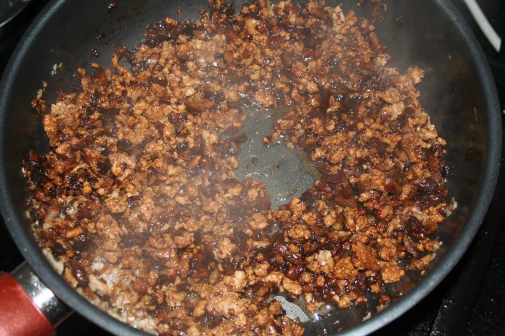 Pendant ce temps, faire revenir les shiitakes avec le porc, le sucre, la sauce de soja foncée dans une cuillerée d’huile. Laisser l’eau des champignons s’évaporer.