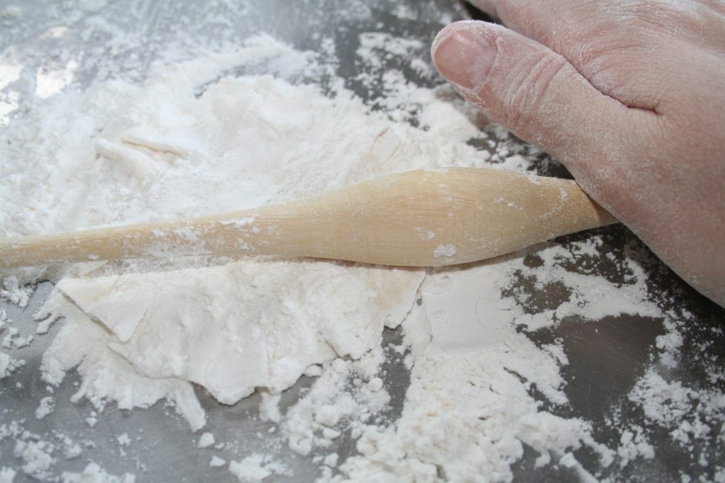 - Etaler ensuite avec le rouleau spécial. On procède de la façon suivante: Il faut tout d’abord avoir les paumes des mains vers la table et avoir au creux de chaque paume, l’extrémité du rouleau. Il faut ensuite appuyer sur le côté droit en roulant vers l’avant puis appuyer à gauche en revenant vers soi.