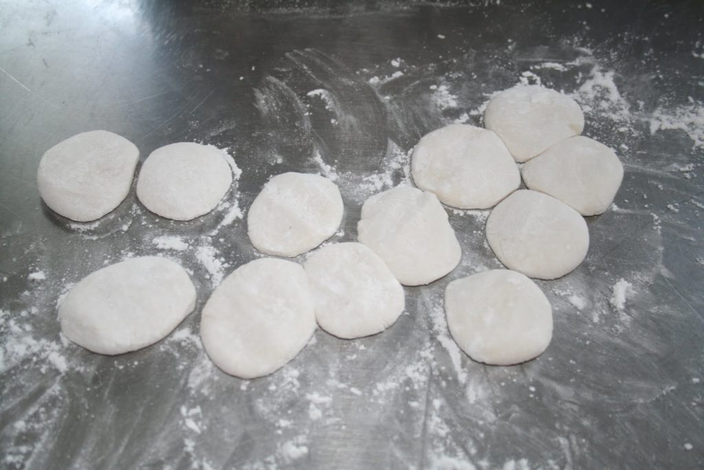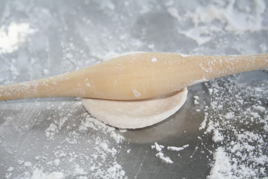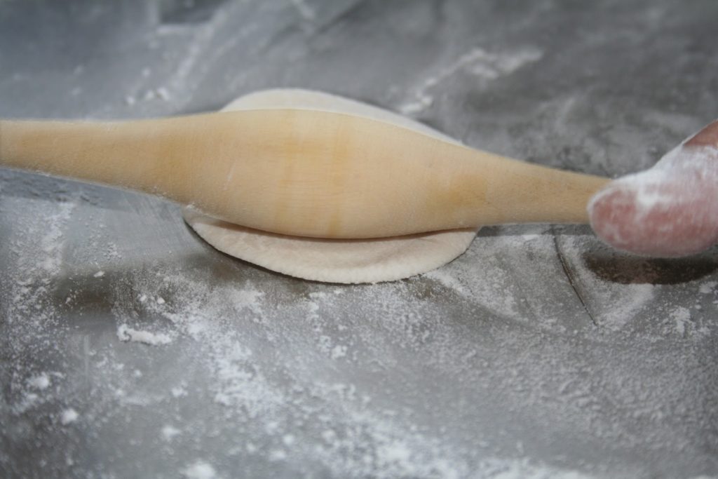 Une fois la pâte aplatie en un disque de 8 à 10cm, il faut placer un petit tas de farine sur le plan de travail, placer le disque dessus et remettre de la farine sur la pâte. Le disque de pâte est donc complètement dans la farine. Il faut placer le disque de pâte comme sur la photo ci-dessous et aplatir uniquement cette fois le bord en roulant vers le haut en appuyant sur la droite (la photo est peut être plus claire). De cette façon, le bord va se « denteler » et se friper. Plus il y a de farine autour de la pâte, plus il est facile de denteler le bord. Il faut s’entrainer un peu mais au bout de 10 minutes, c’est très facile. Le disque ressemble un peu à un soleil à la fin de ce processus.
