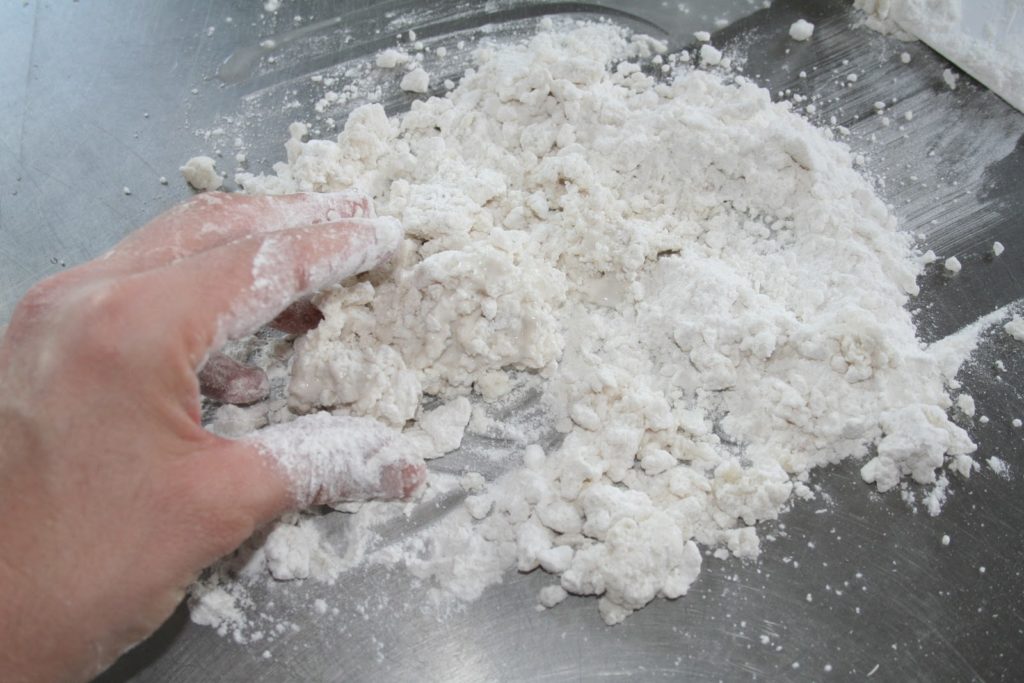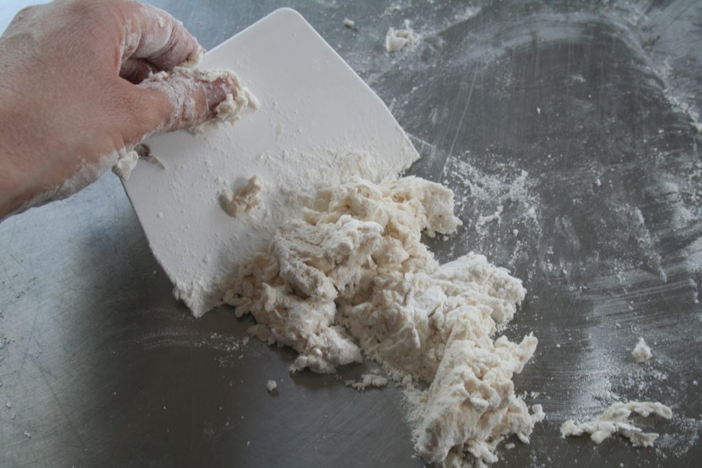 - Ramener toute la farine avec une raclette, et bien pétrir la pâte en l’écrasant et en la roulant.