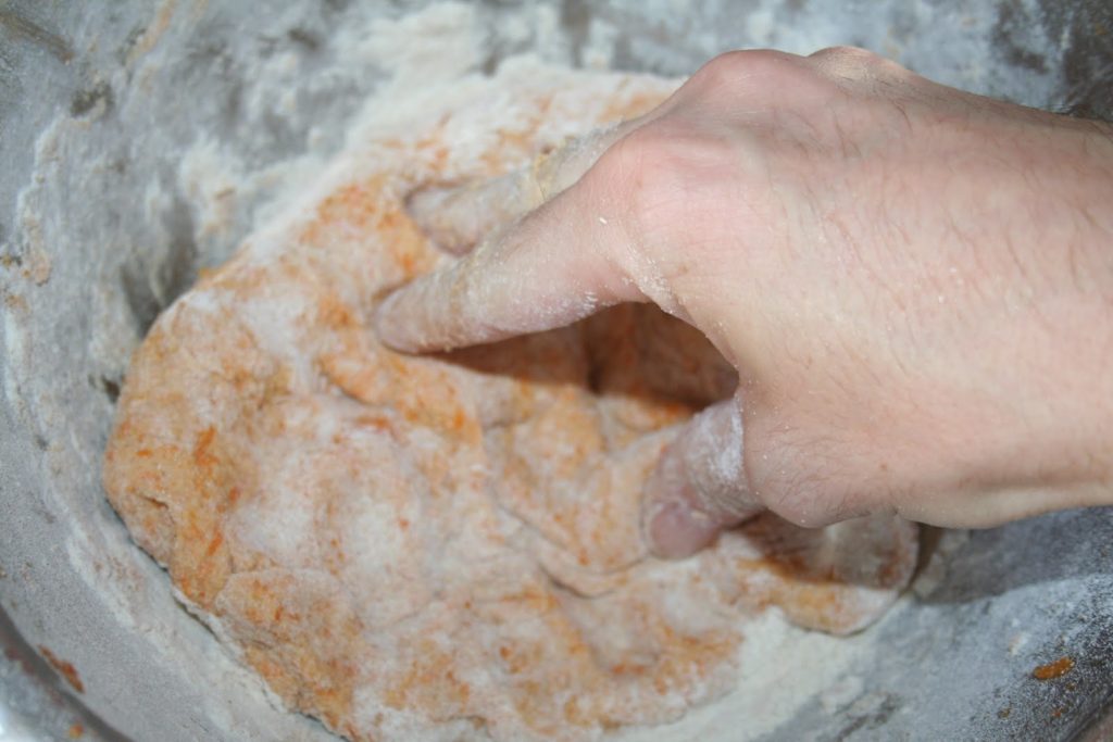Mélanger puis ajouter la farine. Il faut l’ajouter progressivement jusqu’à ce que la pâte ne colle presque plus aux doigts.