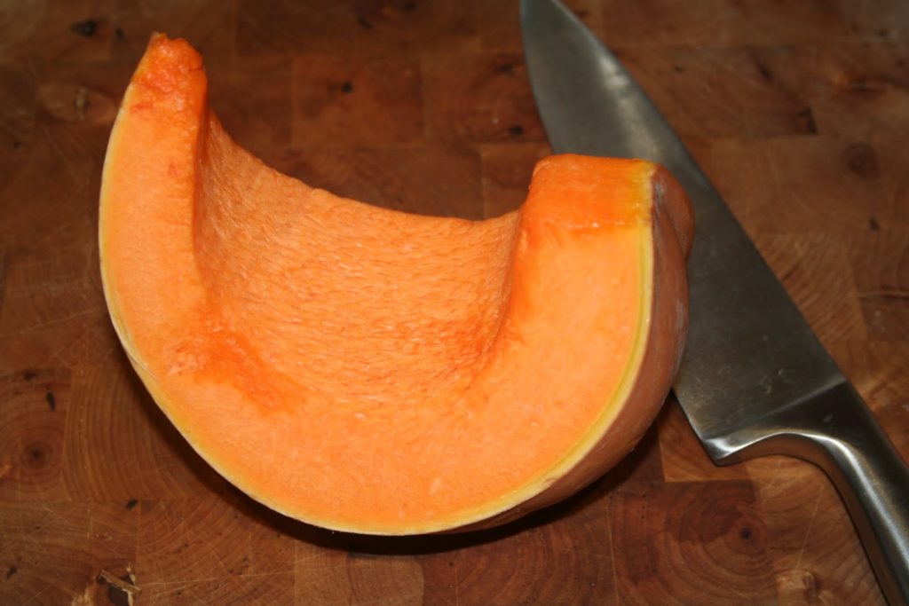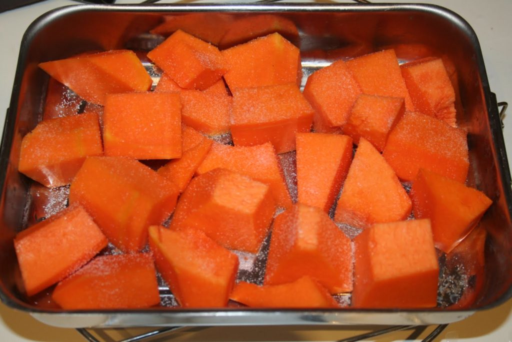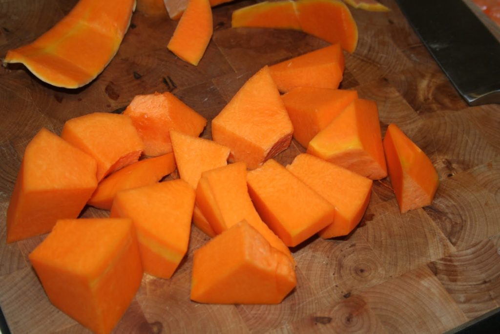 - Enlever la peau puis couper le potiron en morceaux. Peser le potiron sans la peau!