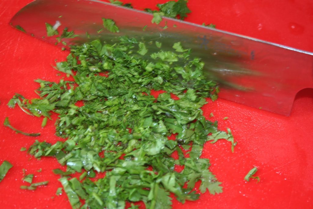 Couper les oignons de la même façon. Hacher le bouquet de coriandre.