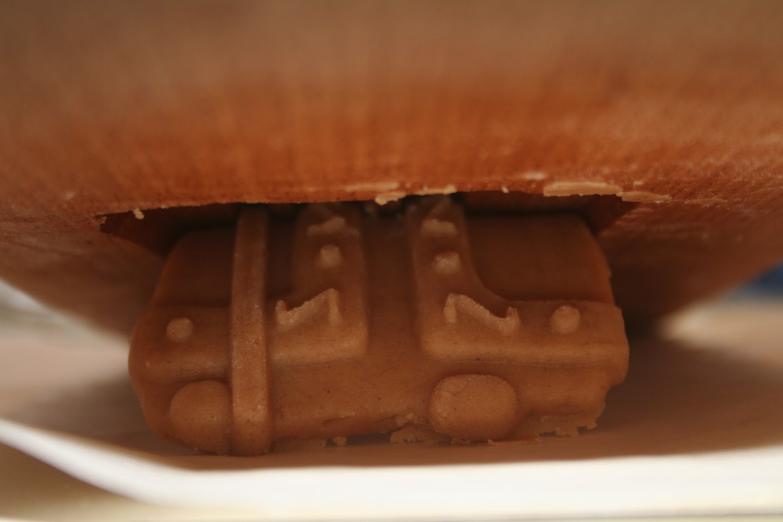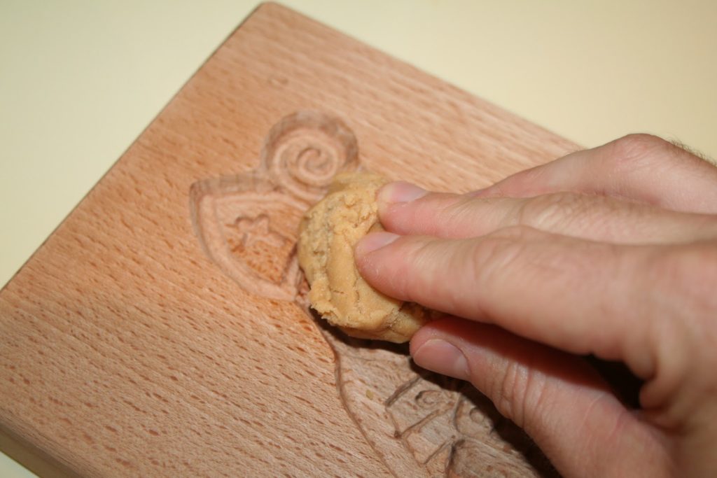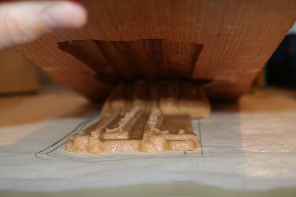 J’ai commandé mon moule chez le sculpteur qui produit ceux de Dandoy…! Les détails sont juste fantastiques! Il suffit de vaporiser un coup de bombe à graisse démoulante (voir la recette des canelés) puis fariner. Il faut taper fort pour enlever le surplus…