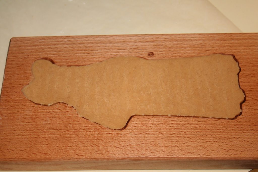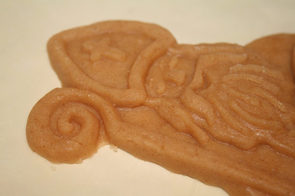 La pâte va alors commencer à tomber et se « dérouler » sur le papier. Il faut bien accompagner le moule ne le soulevant de plus en plus.Le plus délicat est bien sûr la tête du Saint Nicolas!