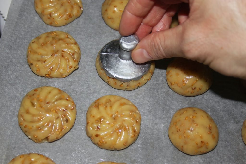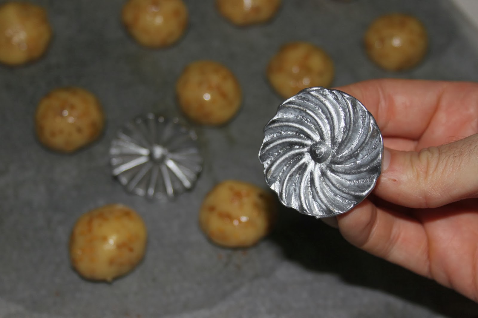 - Vous pouvez utiliser un petit motif pour dessiner la pâte en surface. Tout peut faire l’affaire. Ici, j’ai trouvé des poussoirs qui permettent de faire de jolis motifs très simples. Sinon, il suffira d’écraser un peu la pâte avec la paume de la main.