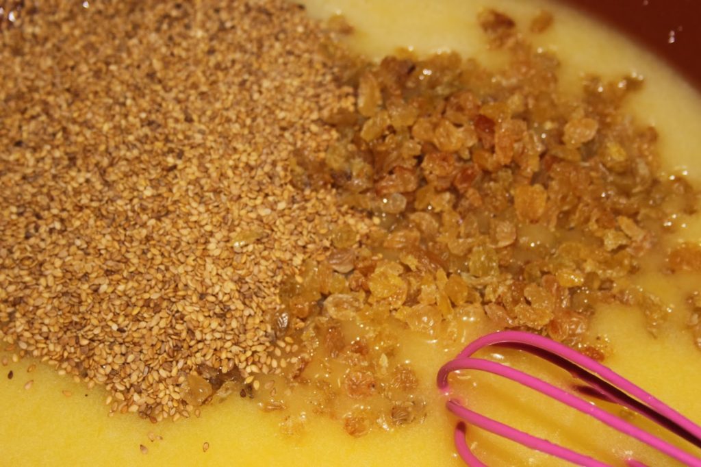 - Mélangez les œufs, le sucre glace, l’huile et le beurre fondu jusqu’à avoir une crème.