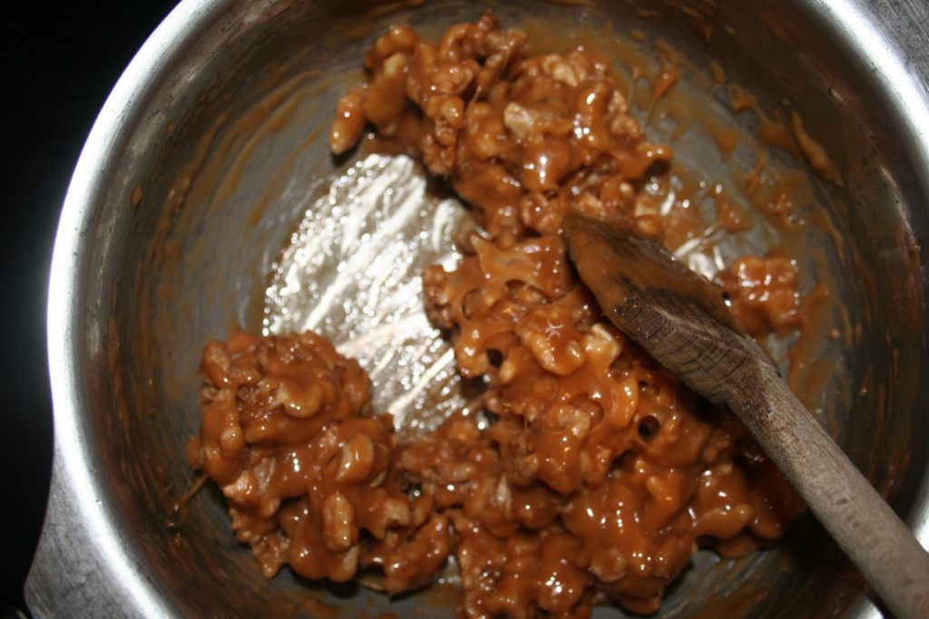 Garnir les fonds de tarte cuits à blanc avec les noix au caramel. On peut en garnir 4 si l’on souhaite des tartelettes nourrissantes, ou bien 6…