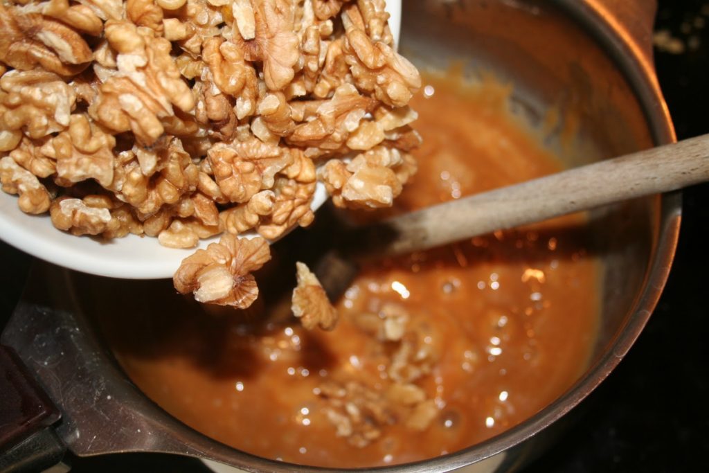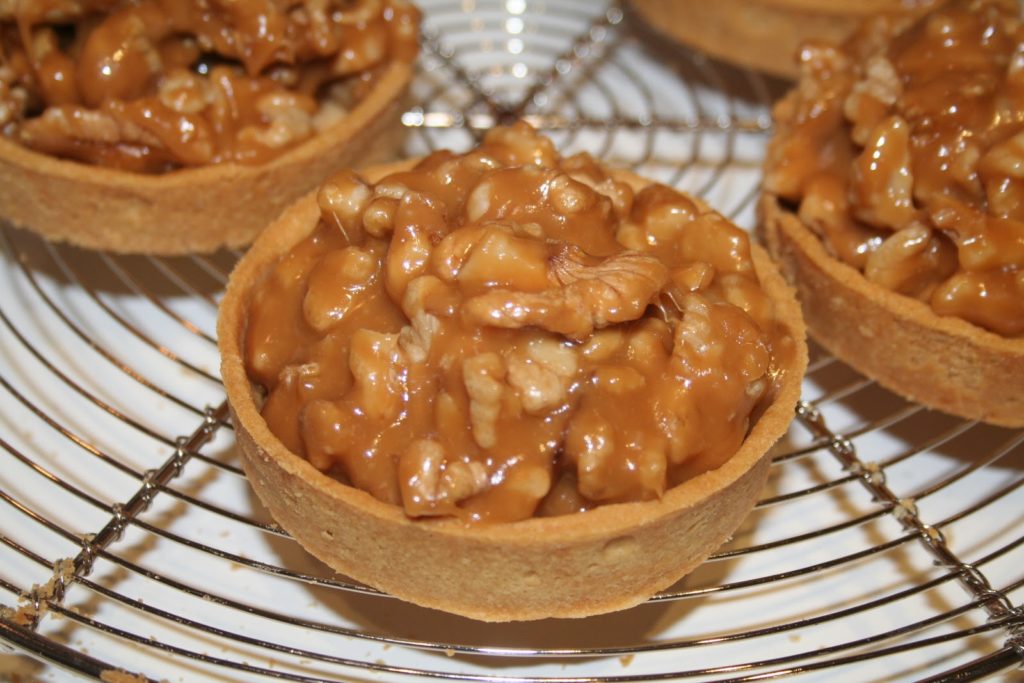 - Garnir les fonds de tarte cuits à blanc avec les noix au caramel. On peut en garnir 4 si l’on souhaite des tartelettes nourrissantes, ou bien 6…