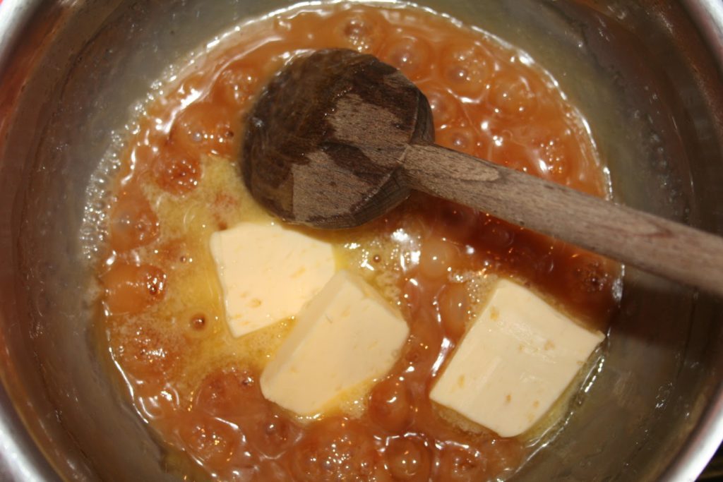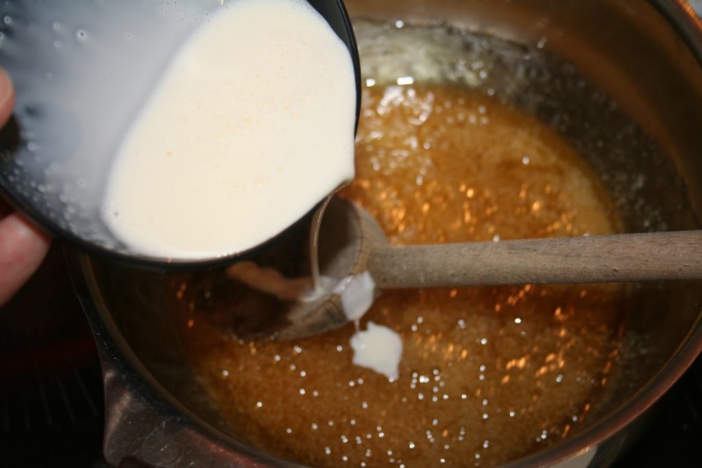 - Ajouter la crème réchauffée pour éviter les projections de sucre.