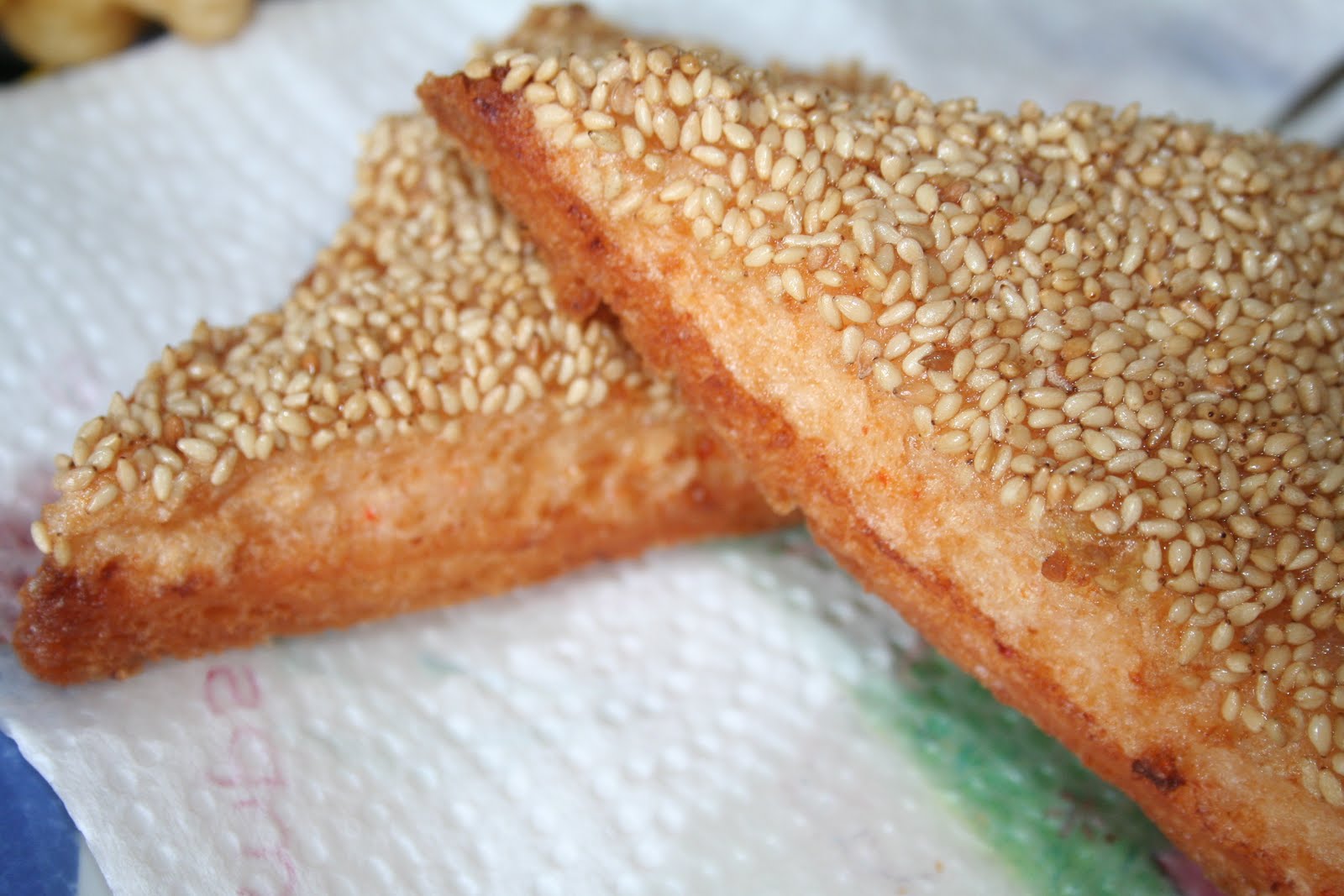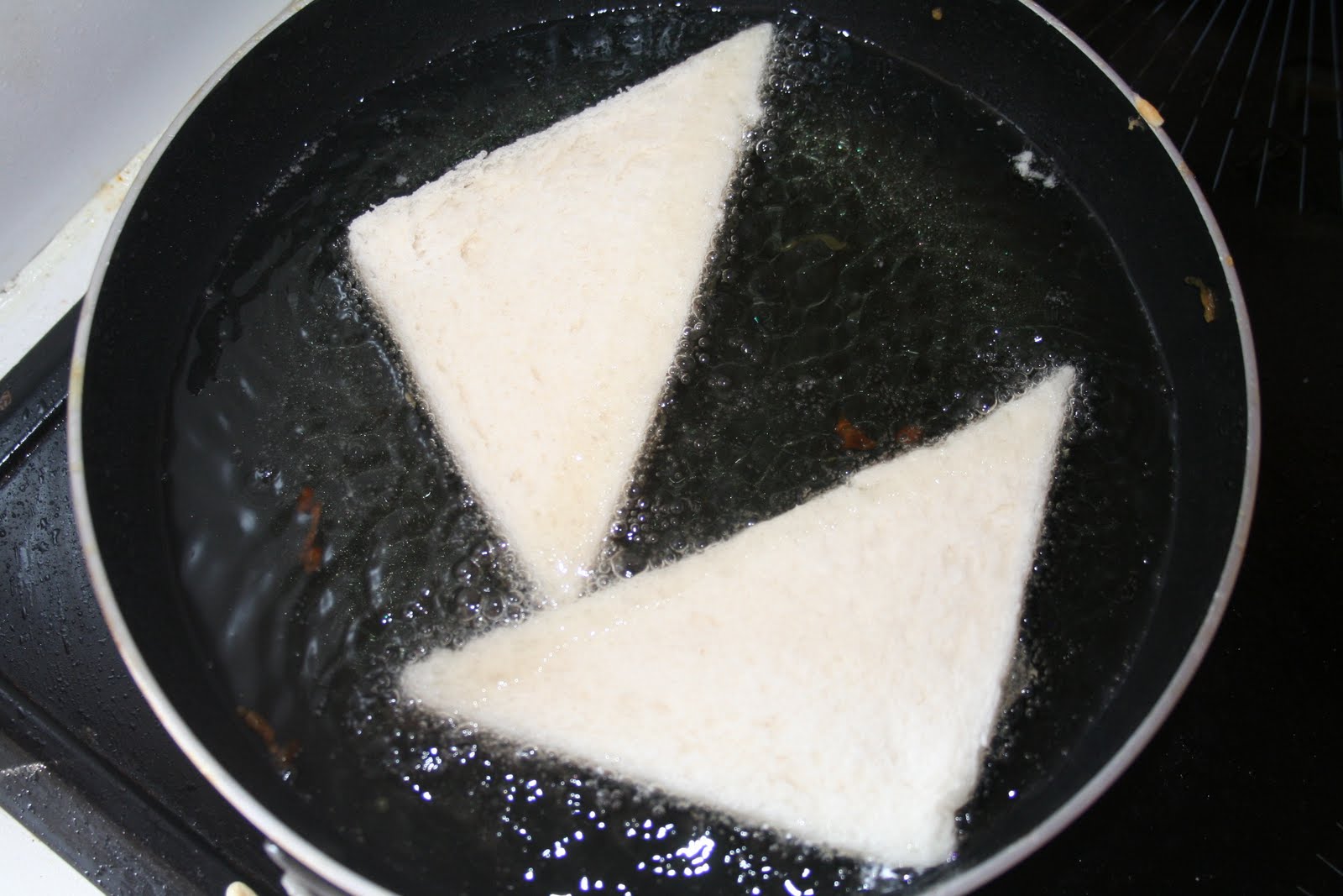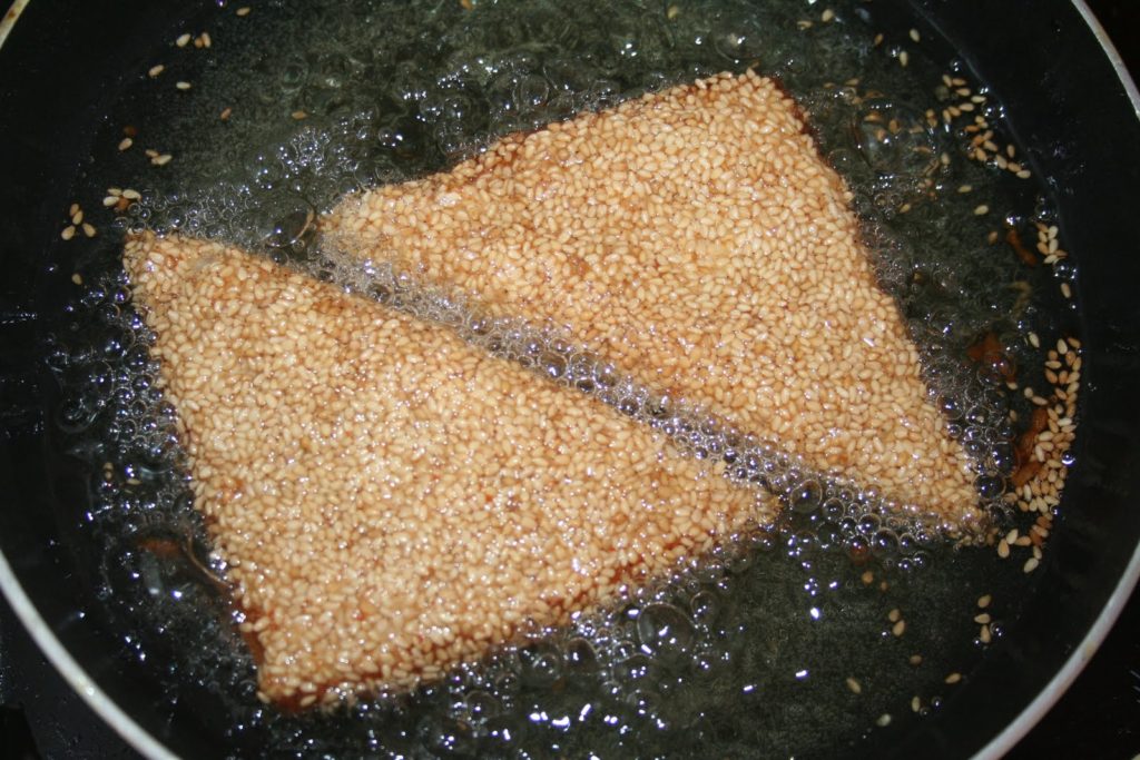 - Mettre de l’huile à chauffer dans une poêle (il faut au moins 1cm d’huile dans la poêle). On peut prendre une poêle plus grande pour frire plus de toasts! Puis frire les toasts côté sésame en premier.