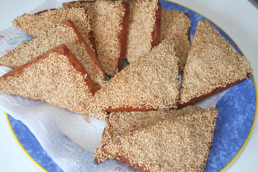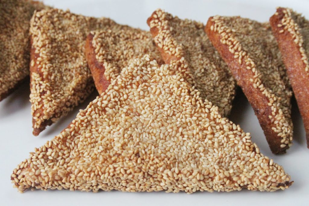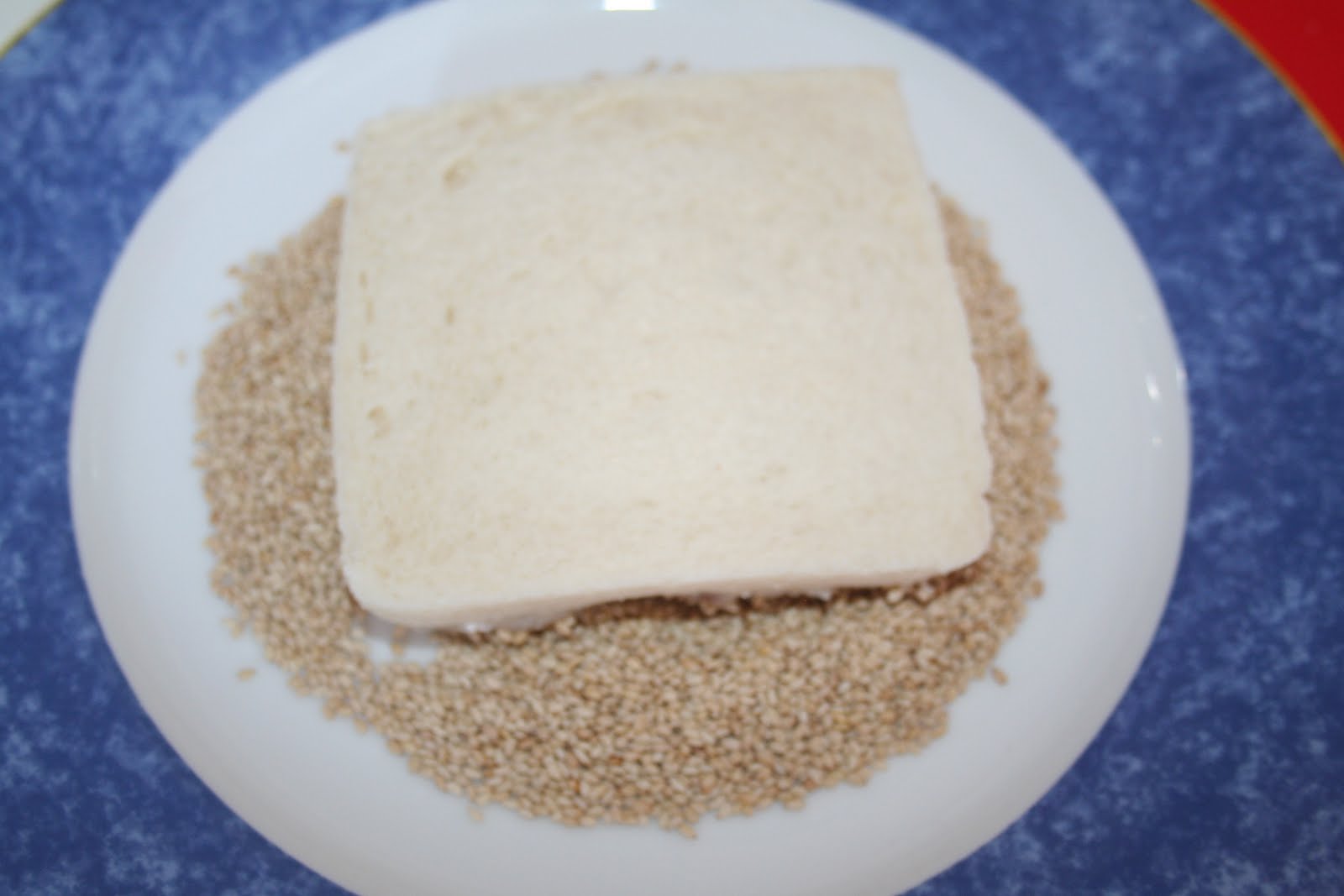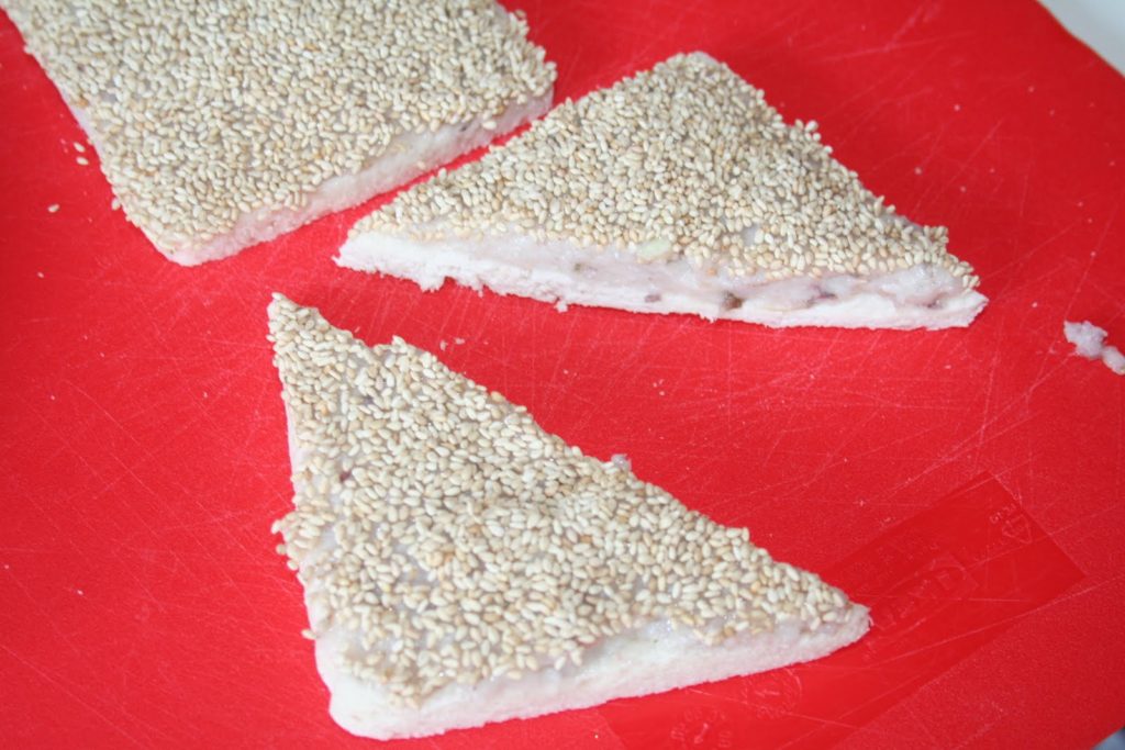 - L’étaler au couteau uniformément sur toute la surface. Mettre les graines de sésame grillé dans une assiette et mettre les toasts côté farce dans celles-ci.