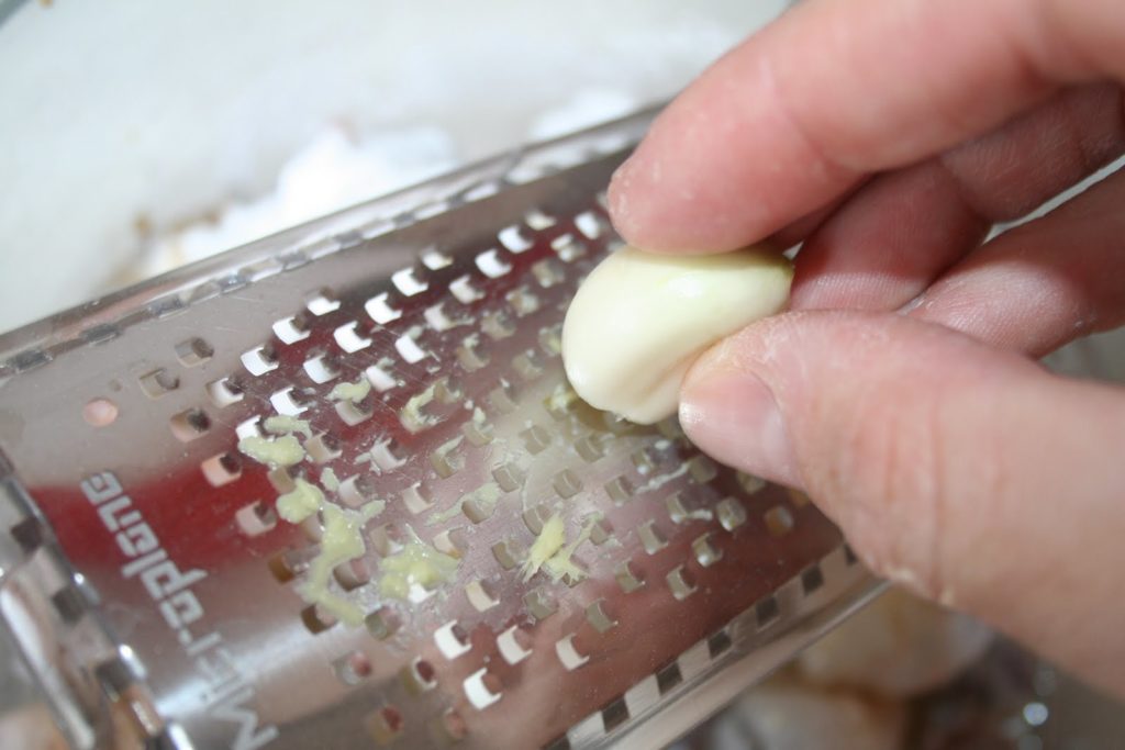 - Râper ou écraser la (ou les) gousse(s) d’ail.