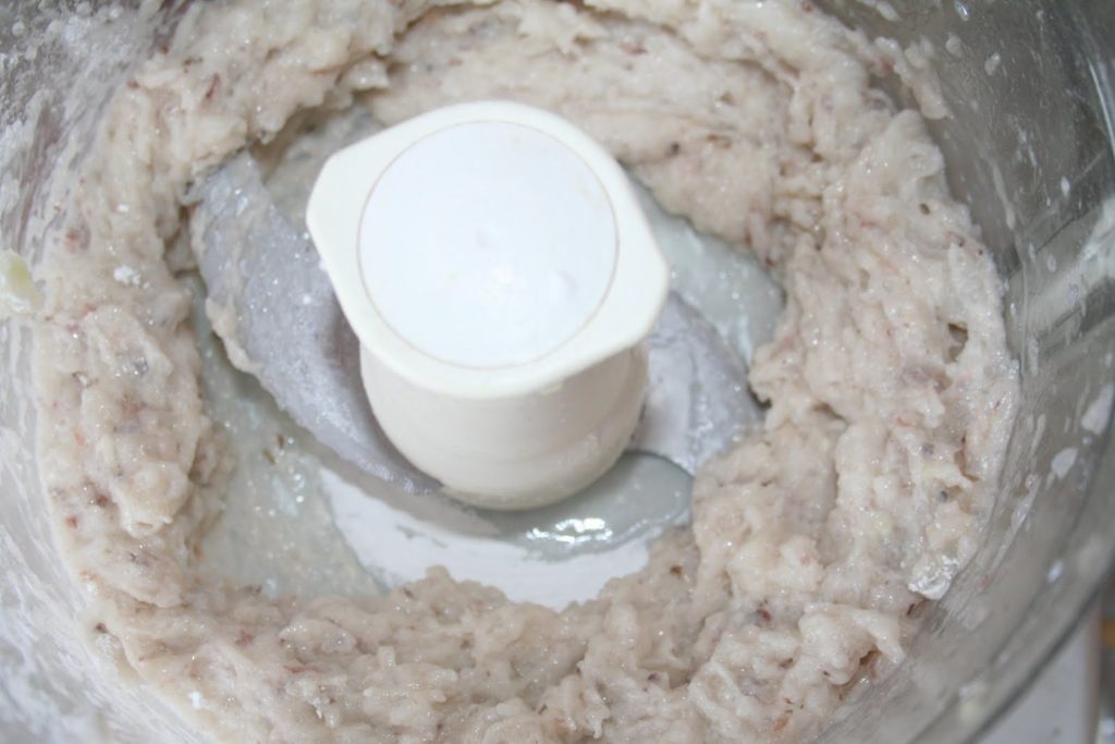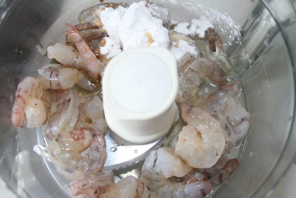 - Mettre les crevettes crues décortiquées, le blanc d’oeuf, l’huile de sésame (éventuellement la coriandre) et la fécule dans le bol du robot mixeur.