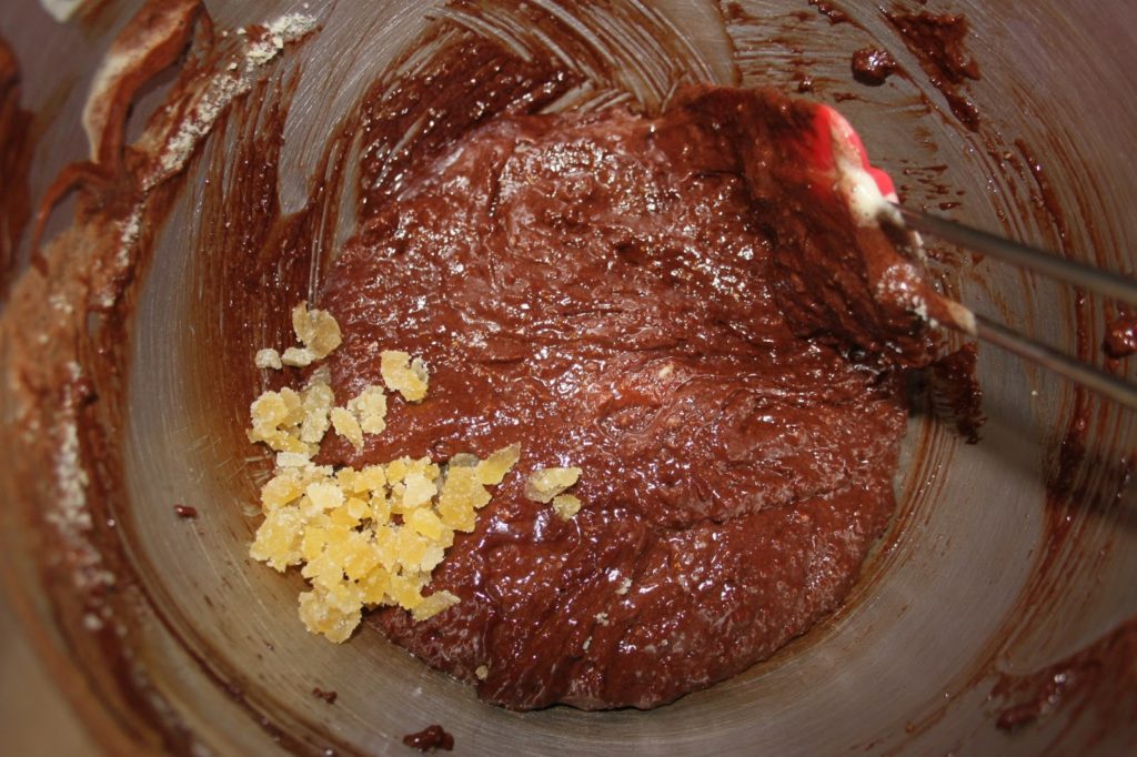 Couper le gingembre confit (David le fait tremper dans de l’eau tiède avant de le couper, mais j’adore le sucre du gingembre…) en petits morceaux.
