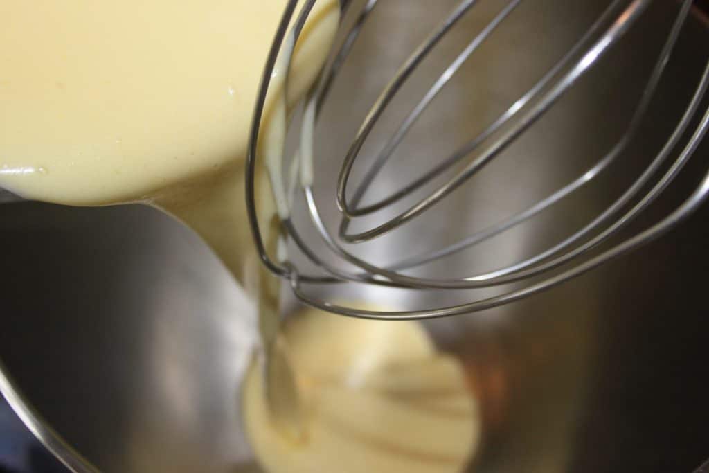- Versez le lait chaud sur le mélange jaune/sucre. Remettez sur feu doux et cuire comme une crème anglaise, c’est à dire sans bouillir. On peut vérifier en cuisant jusqu’à 85°C tout en mélangeant. Je fouette continuellement la crème pendant sa cuisson pour la rendre aérée et onctueuse.