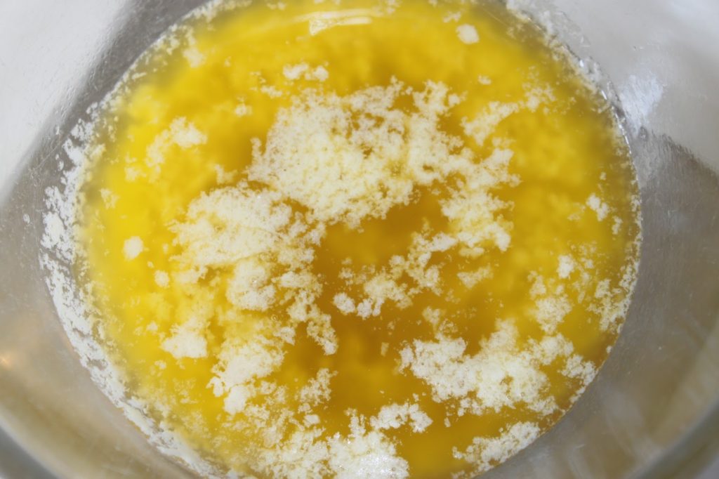 - Versez le miel, le sucre et le beurre fondu dans un récipient.