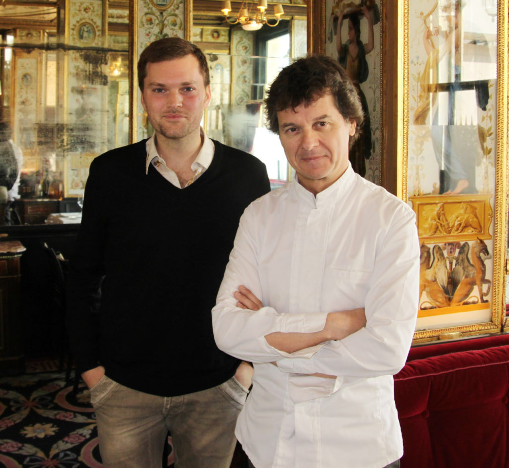 ll y a deux choses différentes. Il y a le plat de la carte, qui peut-être évolue dans le temps, ou un plat qui va rester trois mois sur une carte. Ici, au Grand Véfour, l’appellation peut être la même, mais il peut évoluer en fonction de ce que l’on ressent. Mais on va dire que dans la globalité, le plat ne va pas bouger, parce qu’il a cette appellation. Par exemple, en ce moment, il y a des morilles qui arrivent. Là, c’est compliqué de faire bouger un plat. Par contre il y a le produit du moment qu’on va recevoir, par notre poissonnier par exemple, ou des légumes qui vont arriver comme ça et qui ne sont pas forcément à la carte, donc là oui, forcément, ça va être une recette qu’on va créer exprès pour cet ingrédient qui arrive. Si le poissonnier a de très beaux rougets, il va nous en mettre, si il a des Saint Jacques de la baie de Saint Brieux, on va en avoir, donc ça veut dire qu’on va cuisiner ces produits qui ne sont pas forcément à la carte. On va les avoir en fin de matinée et puis on va les cuisiner. Ce n’est pas quelque chose qui est marqué, qui est écrit dans la pierre, c’est quelque chose que l’on va faire comme ça.