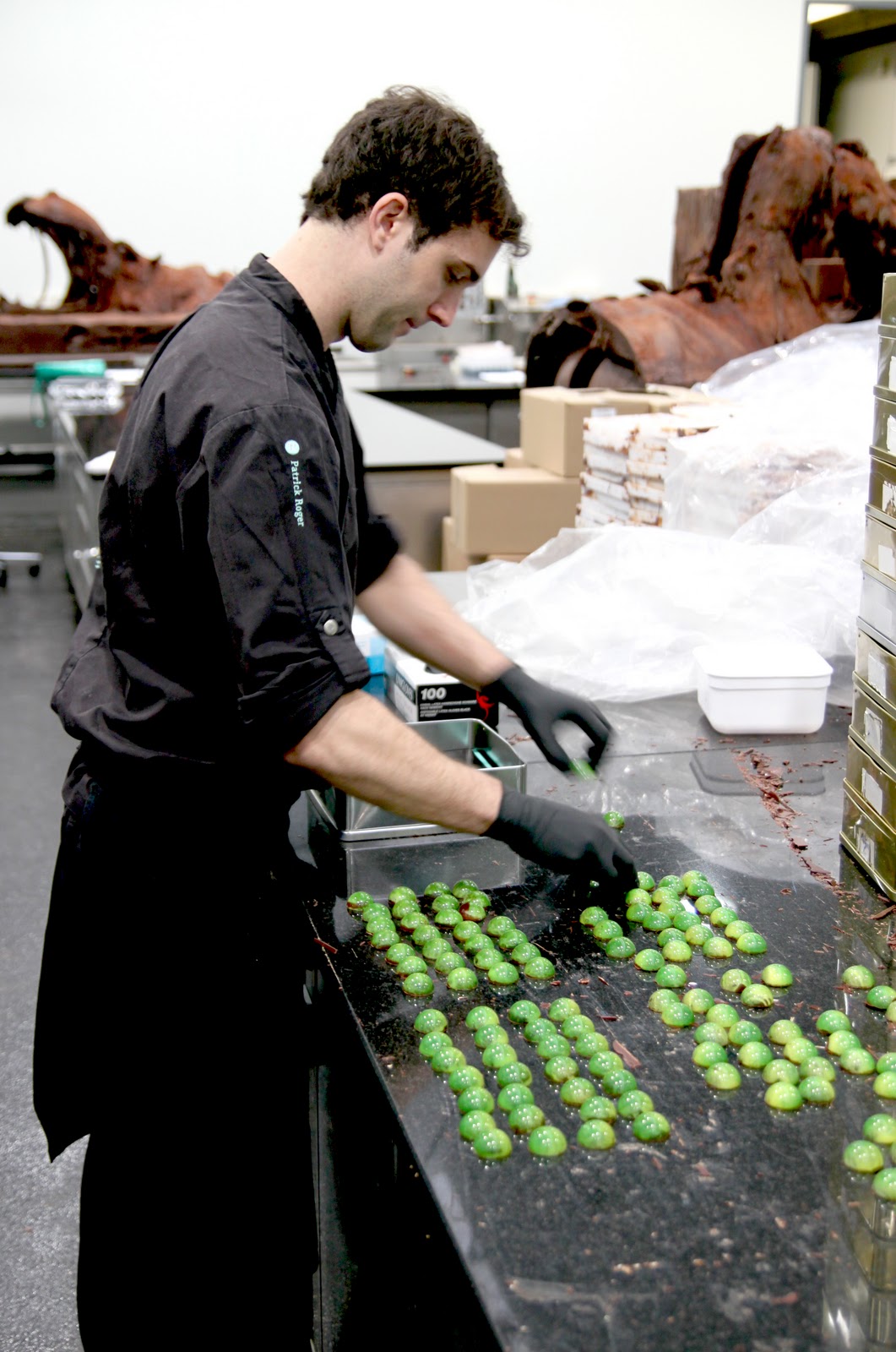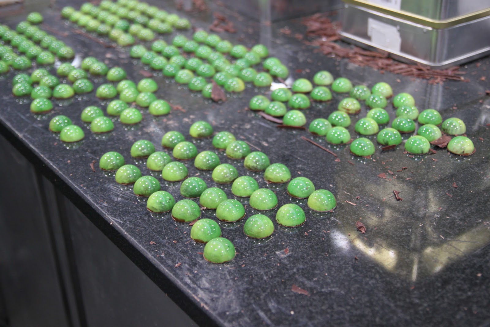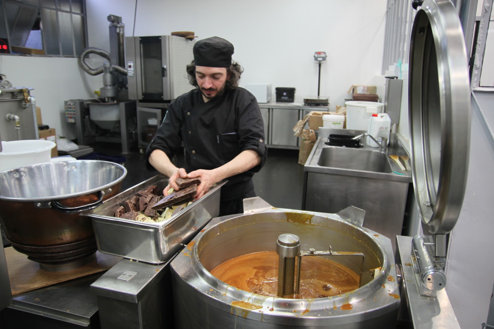 Quelle chance j’ai eu ce jour là! Stefano était en train de préparer le fameux caramel au citron vert. De loin, ce sont mes chocolats préférés (avec les pralinés de Patrick Roger). Cette incroyable machine, brasse le sucre et le cuit en même temps pour un caramel toujours parfait. Du jus de citron vert, des zestes et de la couverture ivoire et noire, et le tour est joué!