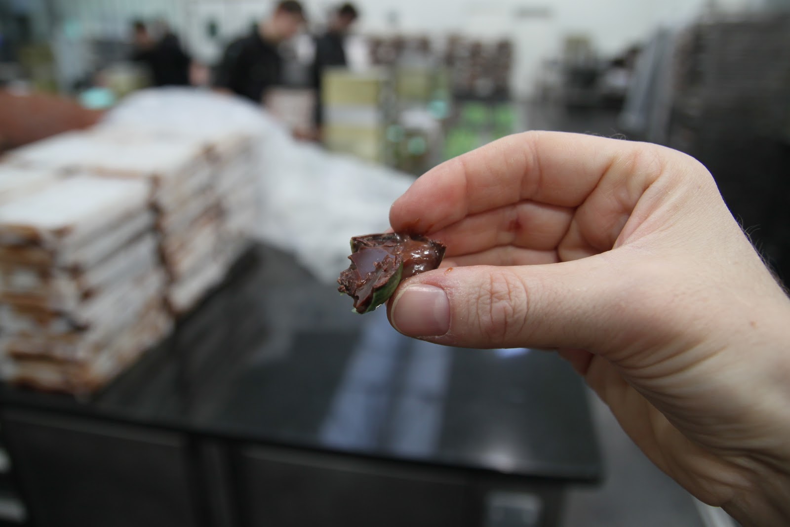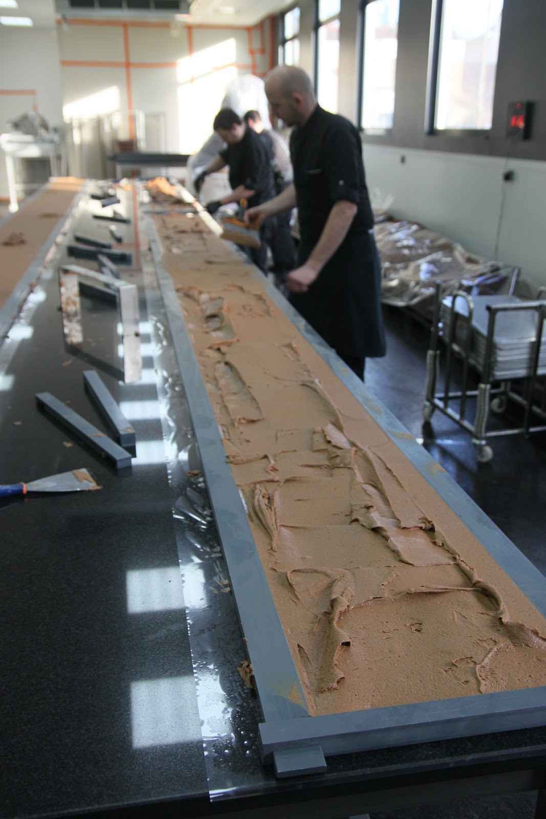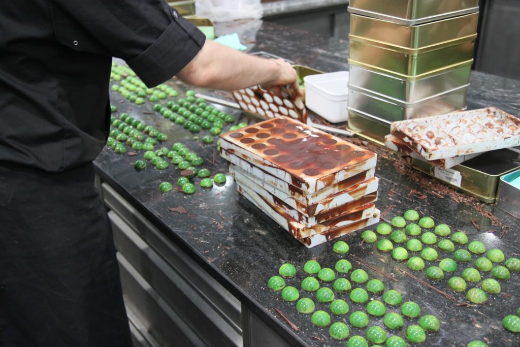 Des kilos de praliné « maison » qui seront débités en petits cubes, puis enrobés de chocolat tempéré.