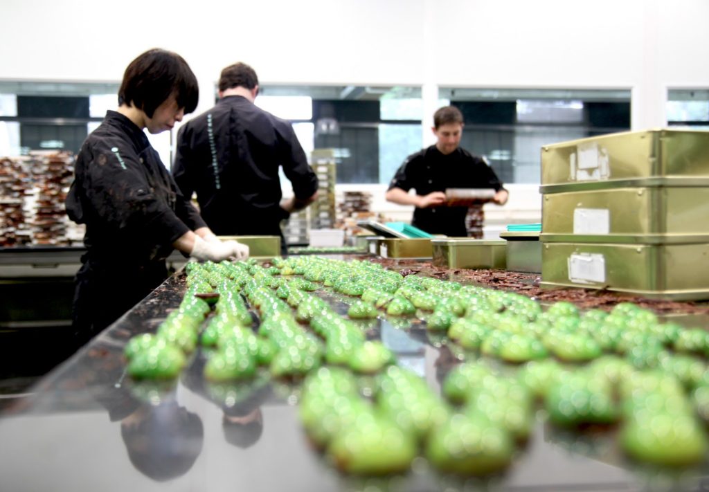 Patrick Roger: Cela a toujours été comme ça. Il faut deux boulangers pour faire un pâtissier etc… Je ne sais pas d’où sort cette notion de valeur arbitraire que l’on donne à ces métiers. En tout cas c’est partout comme cela: il faut deux bouchers pour faire un charcutier. Très souvent c’était comme cela pendant l’apprentissage. C’était ce que l’on entendait. Et puis aujourd’hui on s’aperçoit qu’ils sont tous chez nous: le plongeur, le livreur, l’ingénieur ou un ouvrier qualifié, ils ont tous la même importance. Si il n’y a pas d’électricité, il n’y a pas de chocolatier et ainsi de suite. La vendeuse en boutique a autant d’importance que le chocolatier, mais le chocolatier a encore du mal à l’accepter lui. Pour moi, tout a le même niveau d’exigence.