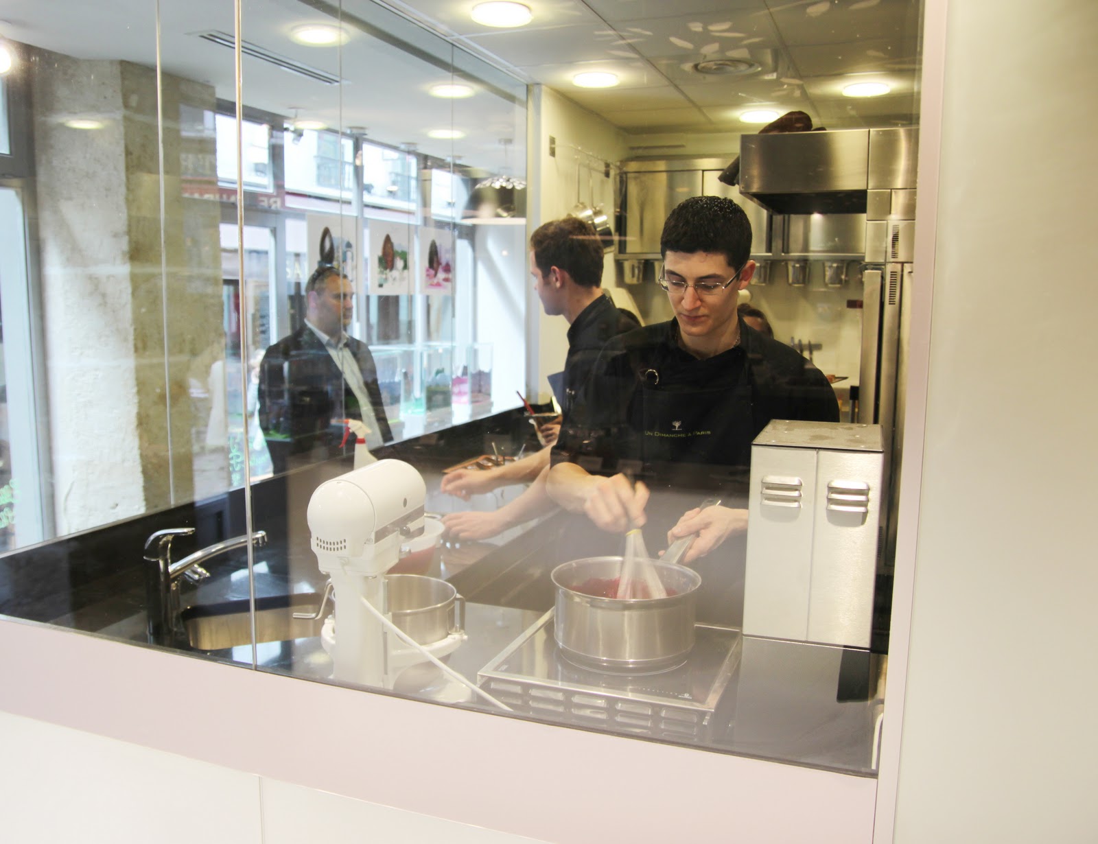 Le plus intéressant (et sans doute le plus agréable pour ceux qui y travaillent!) est la grande baie vitrée qui donne directement sur la pâtisserie.