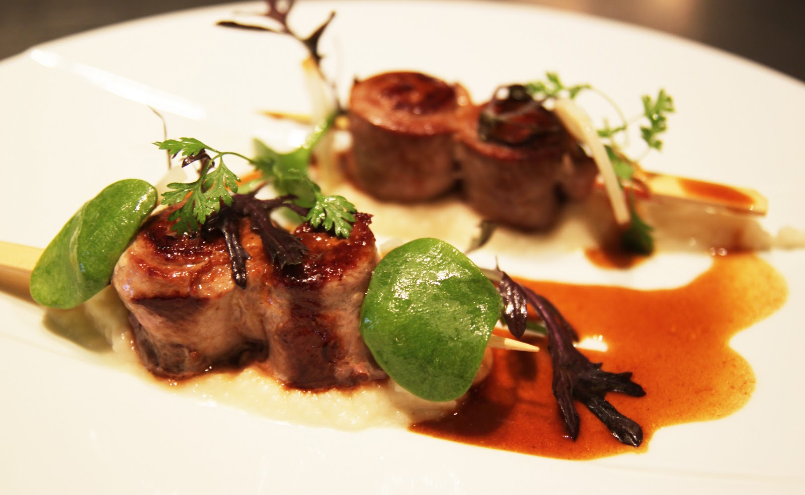 Des brochettes d’aiguillettes de canard sur un écrasé (une purée quoi!) de céleri et navets. Toujours avec notre nuage de Cointreau.