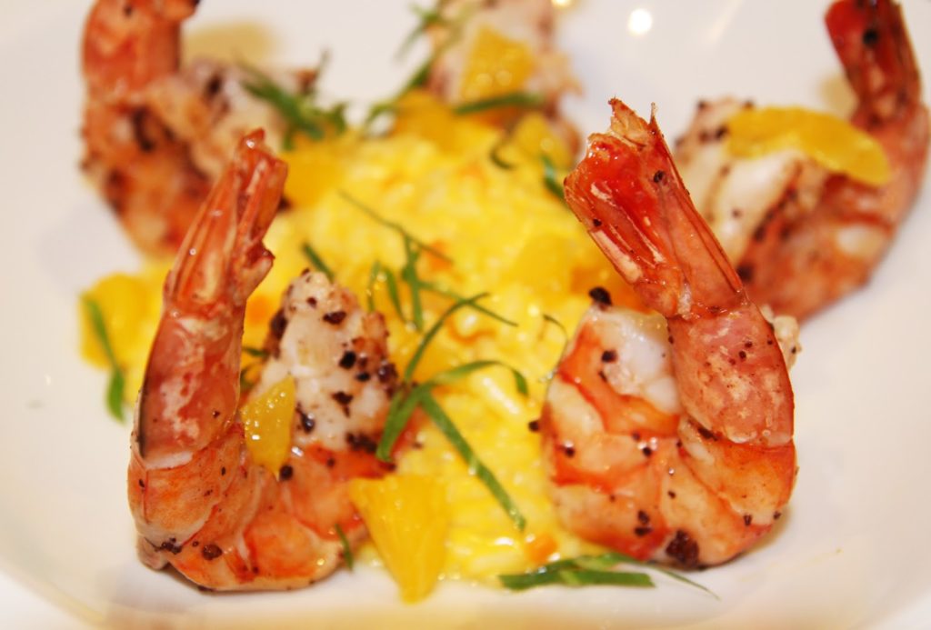 Et un risotto à l’orange et carottes, servi avec des gambas grillées au grué de cacao!