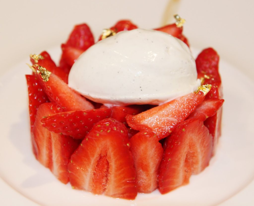 Mais non, c’est un miracle, le tout tient, et même très bien! Car même avec une cuillerée de crème glacée à la vanille, les fraises résistent. Quelques brisures de feuille d’or et un trait de Cointreau Cuisine et nous voilà au septième ciel!