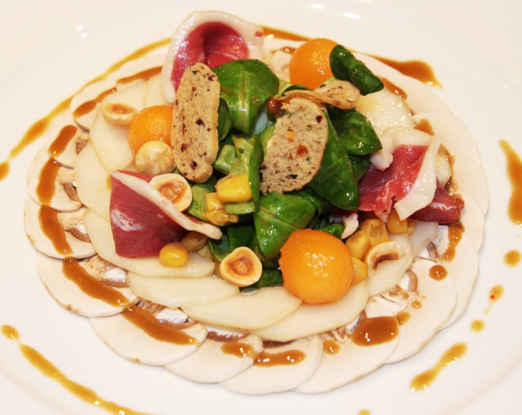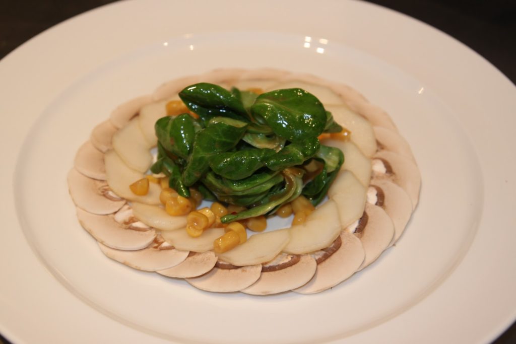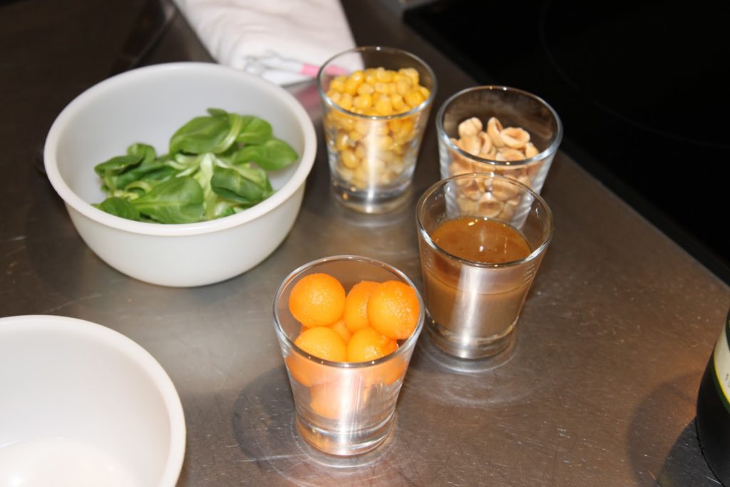 Comme mon appareil photo traine partout, j’ai suivi la recette de notre entrée: la « salade chic et choc »! Je vous donnerai bien sûr la recette dans le site sous peu. Quoique l’on peut aisément la reproduire chez soi. Un peu de maïs, de mâche, de noisettes grillées concassées, de melon en petites boules et d’une vinaigrette au vinaigre balsamique et à l’huile d’olive.