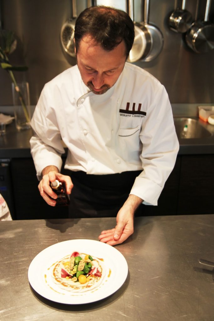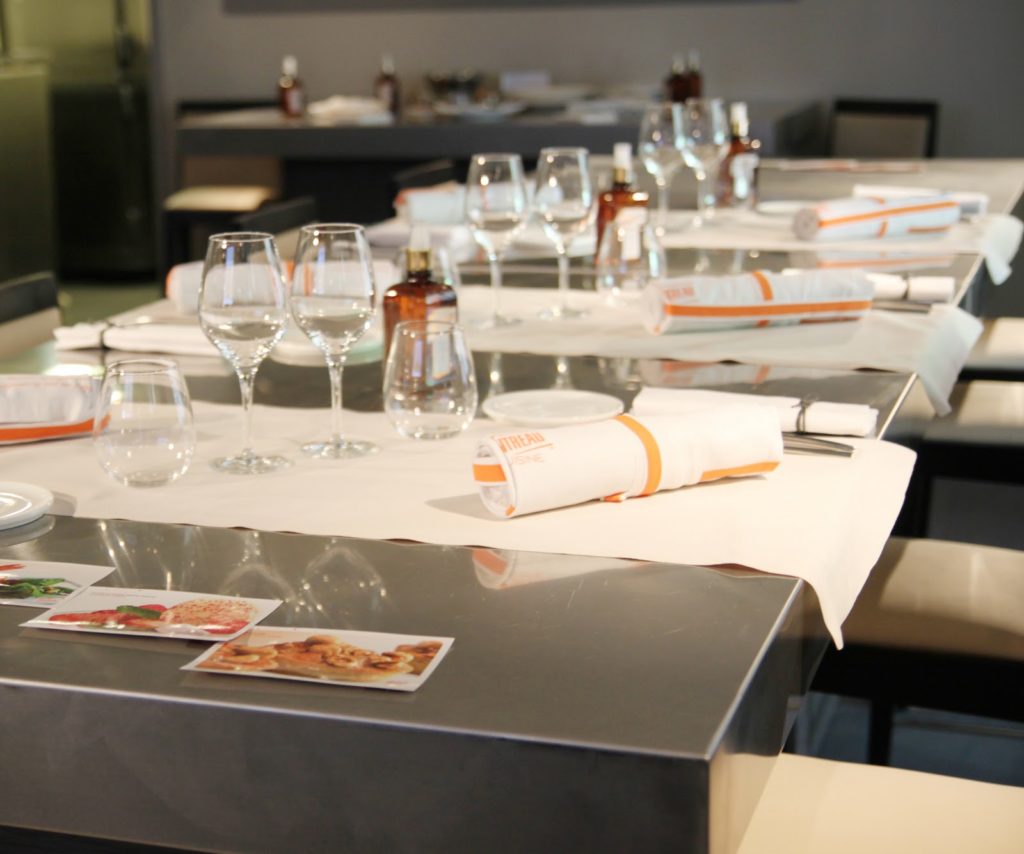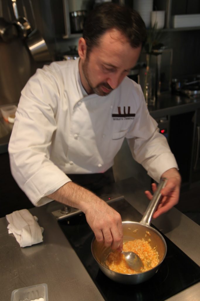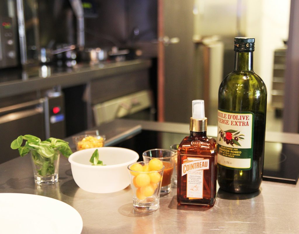 Après cet apéritif rafraichissant (j’ai déjà un peu la tête qui tourne à ce moment là!) nous nous dirigeons vers une pièce où c’est finalement un véritable cours de cuisine qui nous attend! Avec bien sûr, la star du jour: Le « Cointreau Cuisine ». Car tout le repas s’articulera autour d’un nuage délicat de Cointreau. Orange et cacao, le repas s’annonce envoûtant.