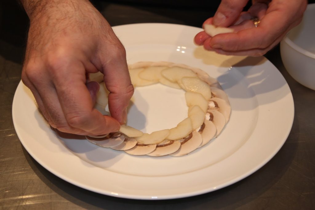 Il suffit de détailler finement des champignons crus et une poire williams, puis de composer une rosace de chaque dans l’assiette.