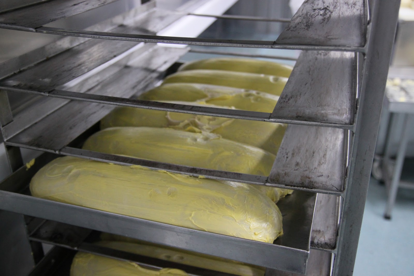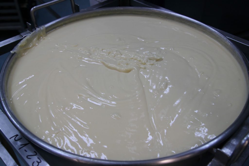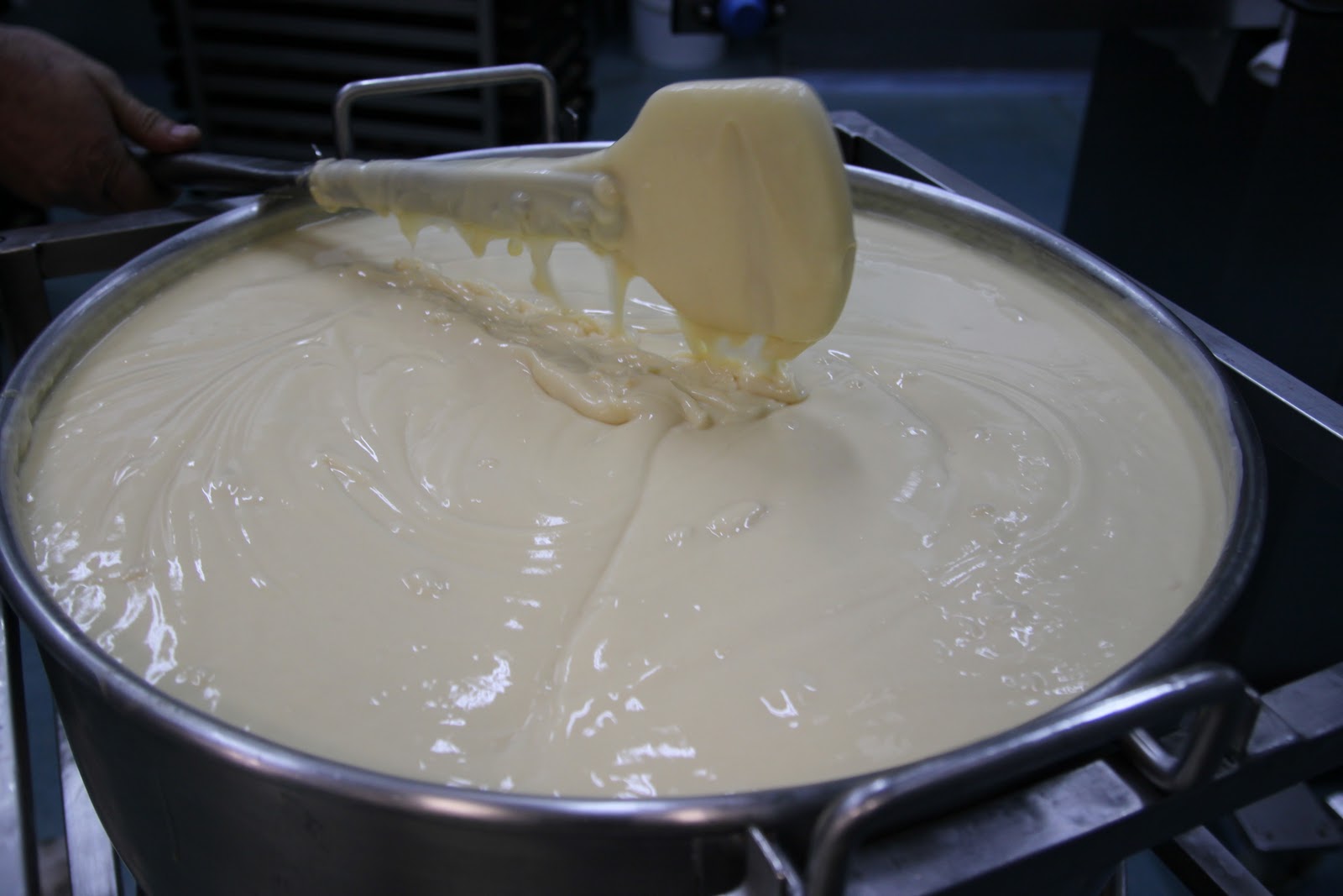 On passe maintenant dans la salle où la crème attend. La crème est préparée la veille et laissée à refroidir toute une nuit au frais.