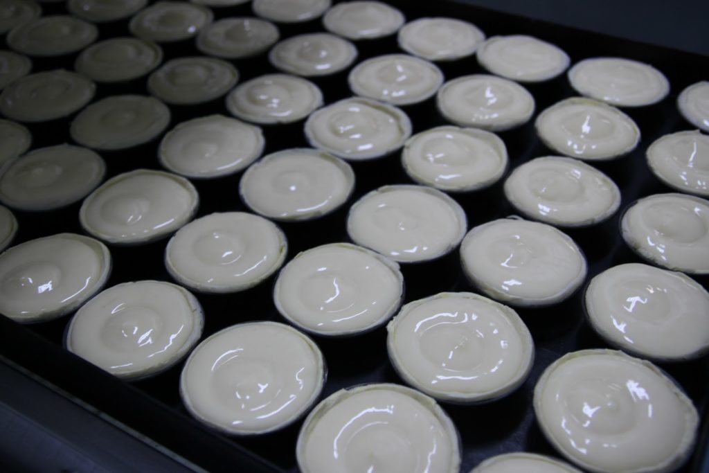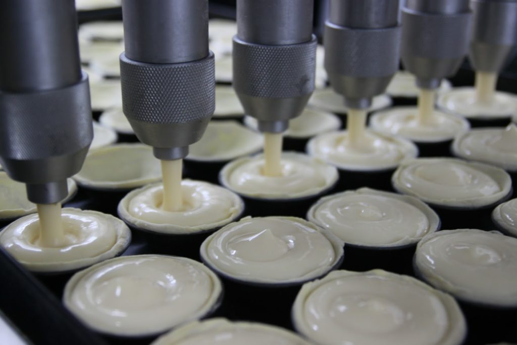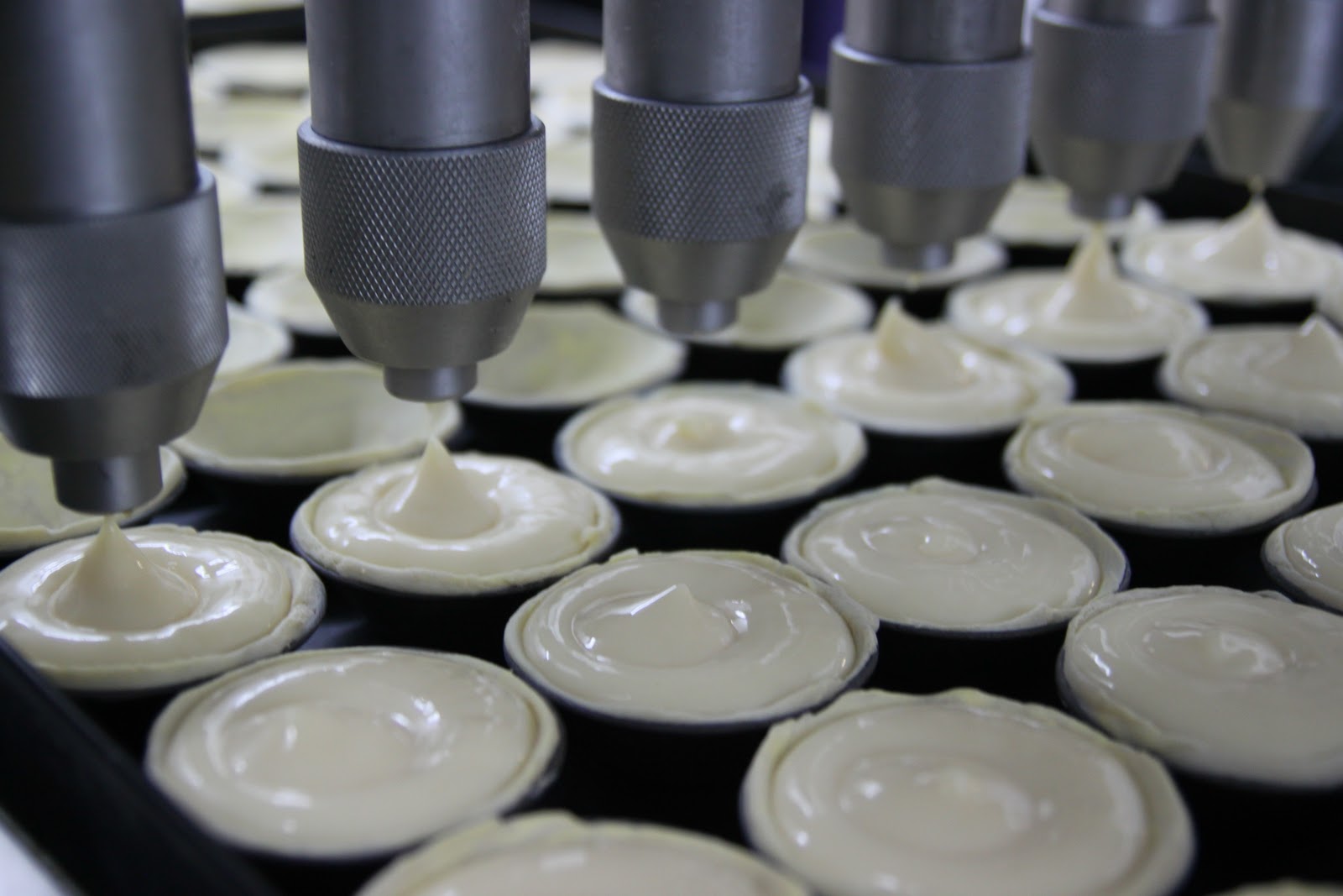 Avec une petite grue, la bassine de crème bien froide est portée vers la machine qui remplit les pastéis.
