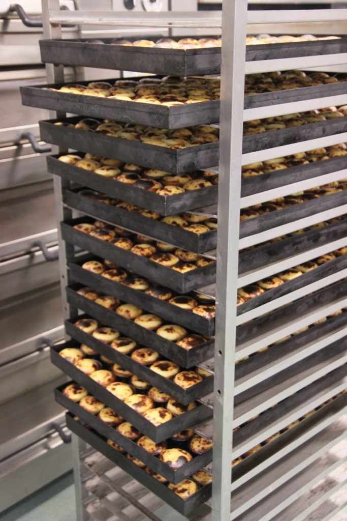 Puis le pâtissier sort les plaques une à une. Il faut faire vite car il les cuit par 15… Donc 900 pastéis qui menacent de brûler.