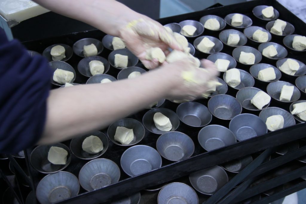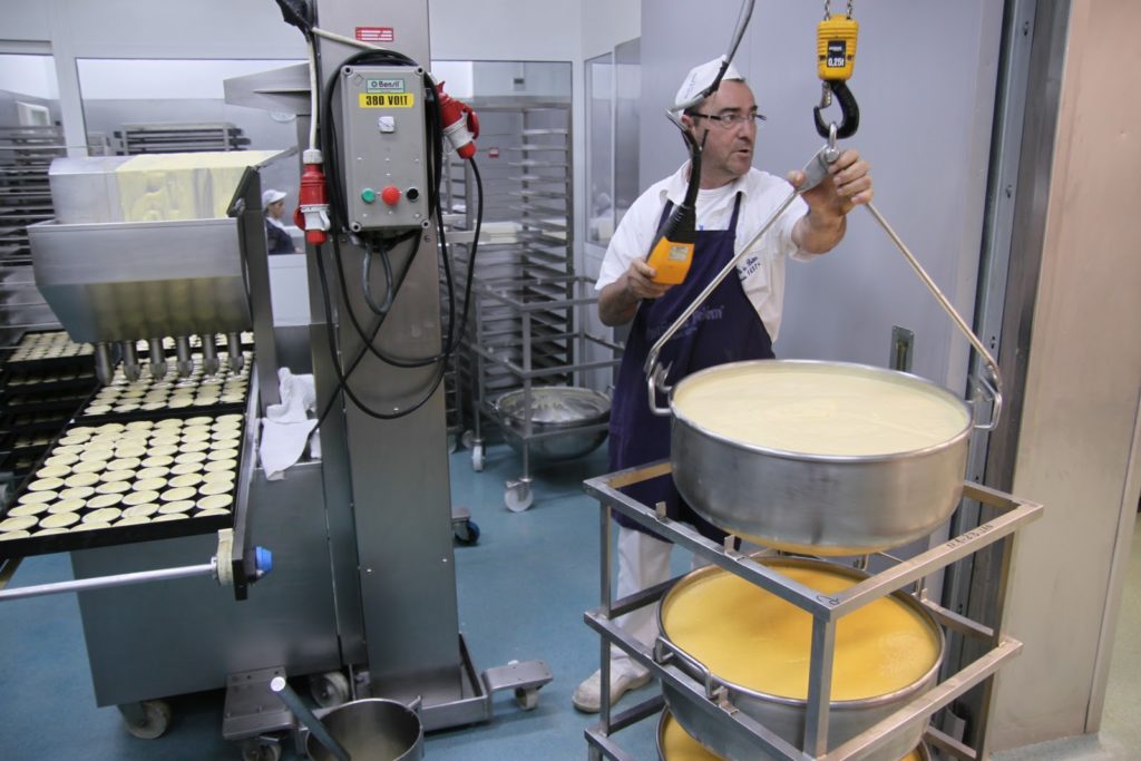 Un chef (celui-ci ne doit pas connaitre le secret de la crème, car chacun a sa tâche précise et il n’y a que 5 personnes à connaitre la recette) mélange bien cette crème vraiment incroyablement onctueuse.