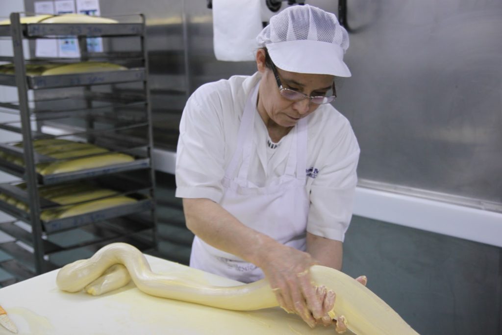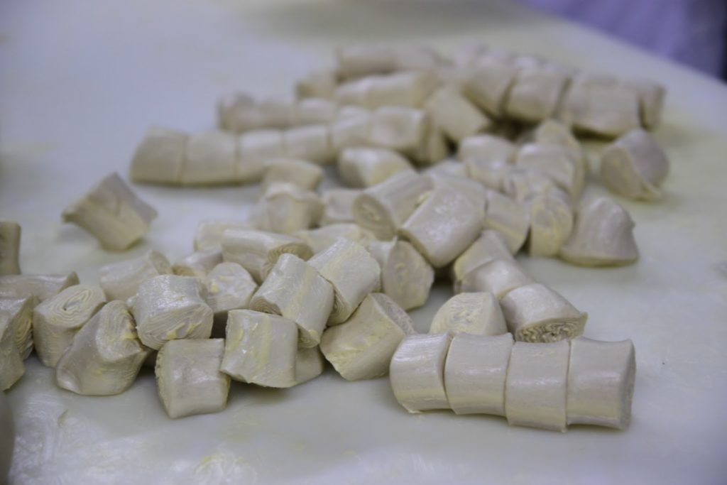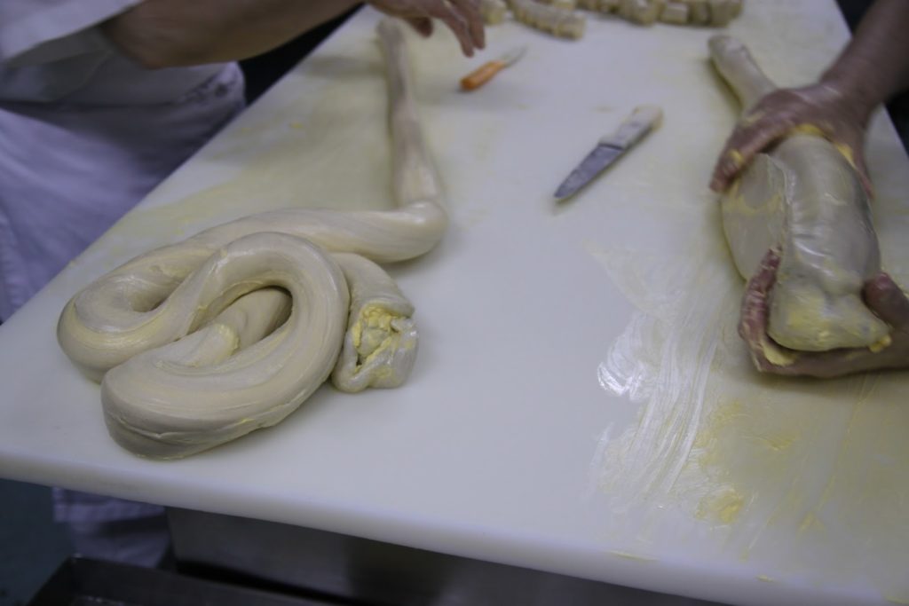 Dans les cuisines, on voit des bacs remplis de la pâte feuilletée préparée sur place. La pâte est roulée en un gros boudin.