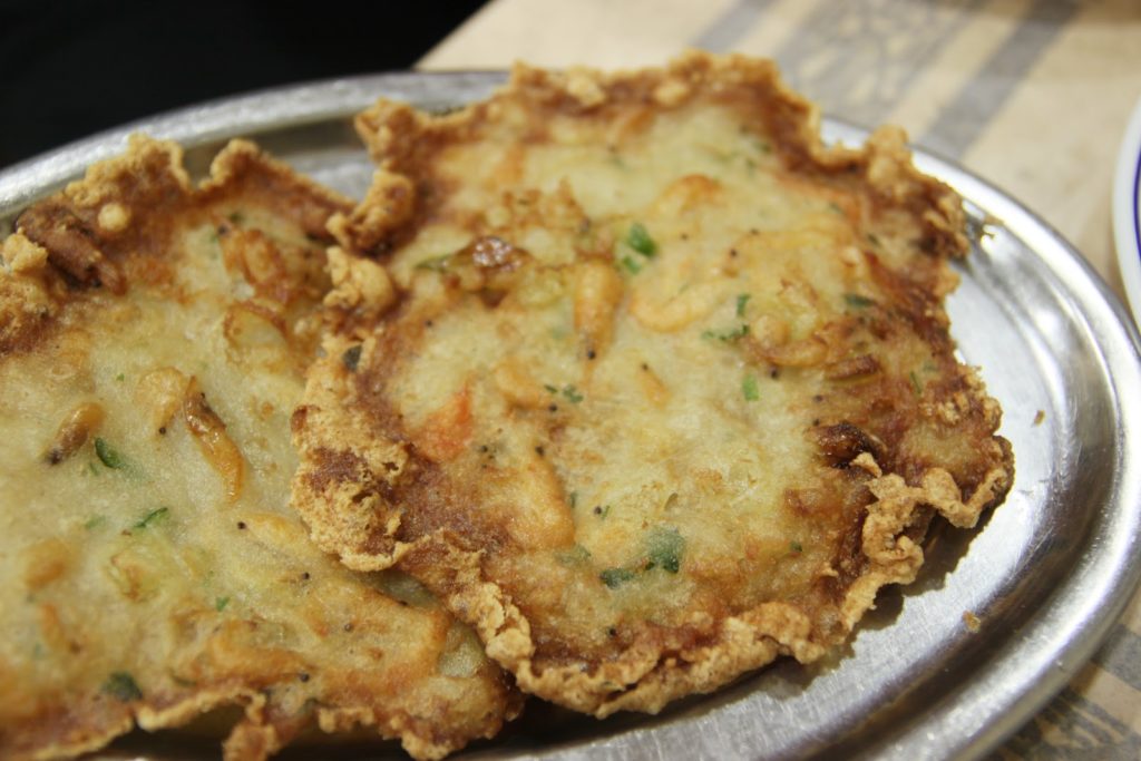 Une autre spécialité du restaurant, des galettes à la farine de pois-chiches et de petites crevettes. Les crevettes sont entières et je pensais que je n’allais pas pouvoir les manger. Mais finalement, on ne sent pas du tout la carapace!
