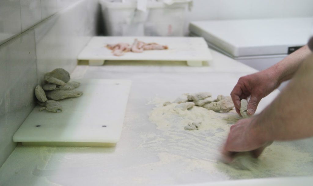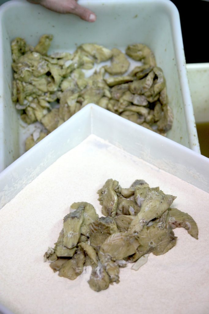 Les poissons sont mis dans la « farine ».