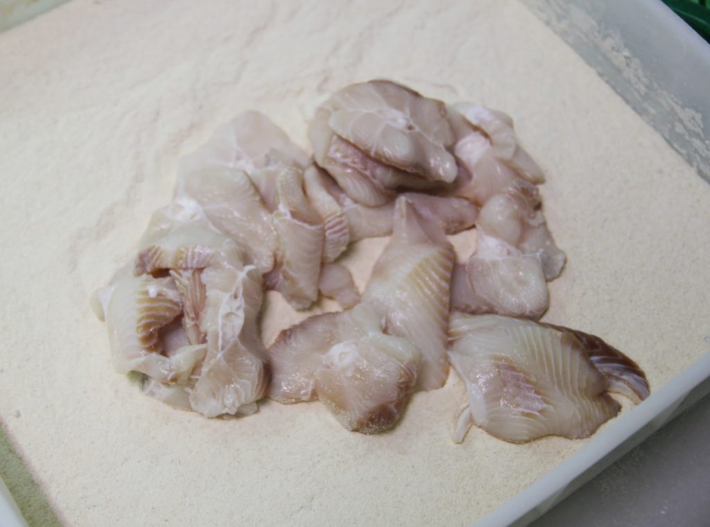 Puis le chef secoue bien le bac pour enrober chaque petits morceaux de poisson.
