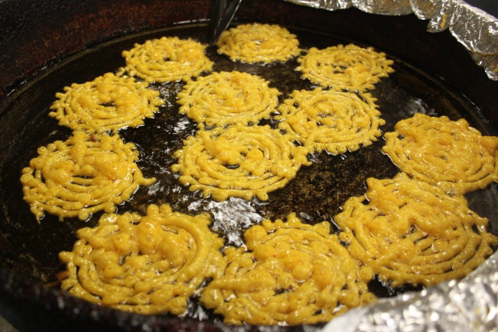 Qu’y a-t’il dans la zlabia? Simplement de la farine, de la levure et de l’eau. Sans oublier un colorant qui peut varier suivant l’humeur du pâtissier, mais qui se situe toujours plus ou moins dans une gamme chromatique jaune-orangée. La pâte repose plusieurs jours. En réalité on la laisse fermenter. On ajoute la couleur le jour de la cuisson. La pâte est d’une consistance assez épaisse mais fluide, comme une pâte à crêpe, plus lourde et visqueuse.